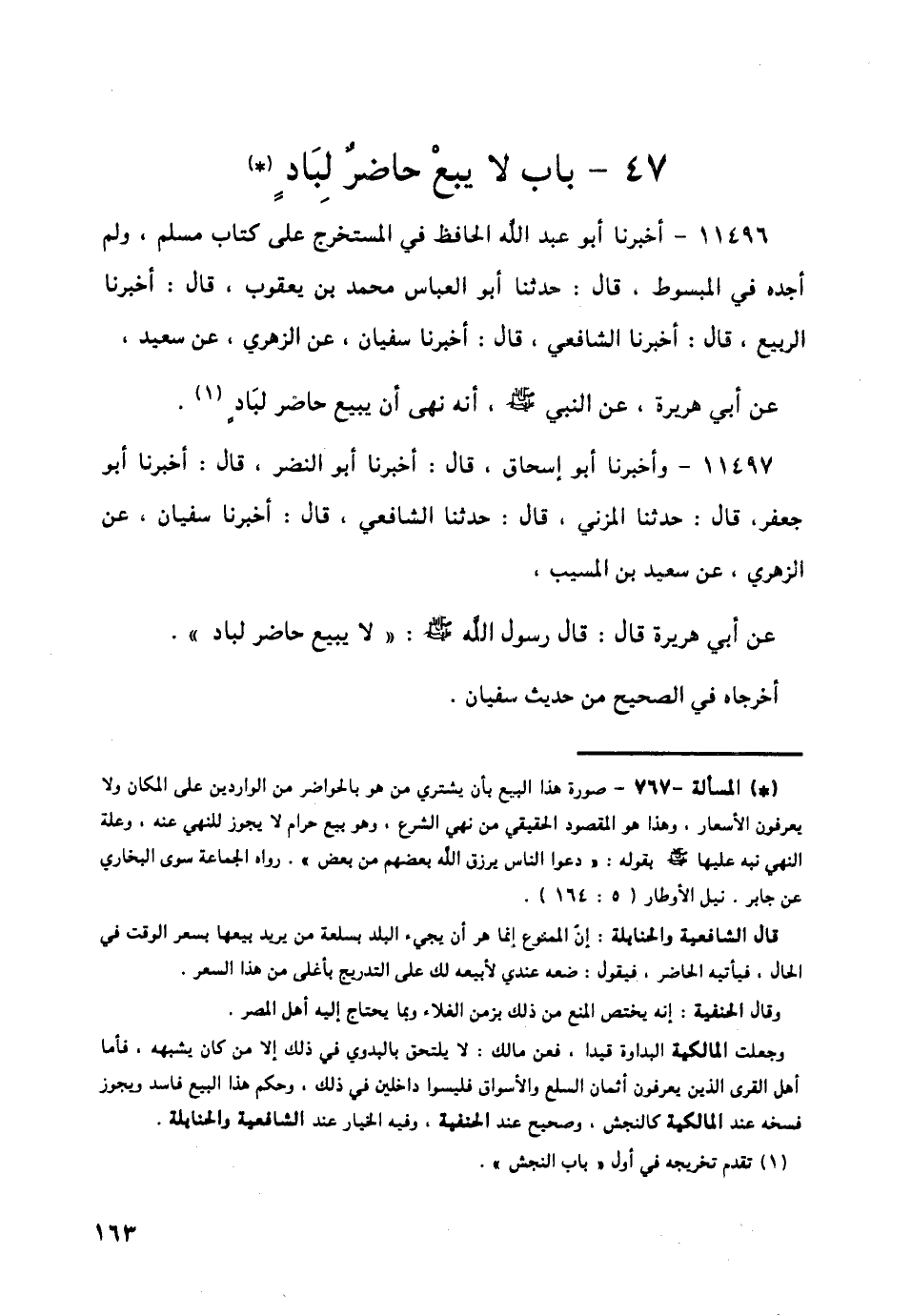 11497 - وَأَخْبَرَنَا أَبُو إِسْحَاقَ قَالَ: أَخْبَرَنَا أَبُو النَّضْرِ قَالَ: أَخْبَرَنَا أَبُو جَعْفَرٍ قَالَ: حَدَّثَنَا الْمُزَنِيُّ قَالَ: حَدَّثَنَا الشَّافِعِيُّ قَالَ: أَخْبَرَنَا سُفْيَانُ، عَنِ الزُّهْرِيِّ، عَنْ سَعِيدِ بْنِ الْمُسَيِّبِ، عَنْ أَبِي هُرَيْرَةَ قَالَ: قَالَ رَسُولُ اللَّهِ صَلَّى اللهُ عَلَيْهِ وَسَلَّمَ: § «لَا يَبِيعُ حَاضِرٌ لِبَادٍ». أَخْرَجَاهُ فِي الصَّحِيحِ مِنْ حَدِيثِ سُفْيَانَ -[164]-.