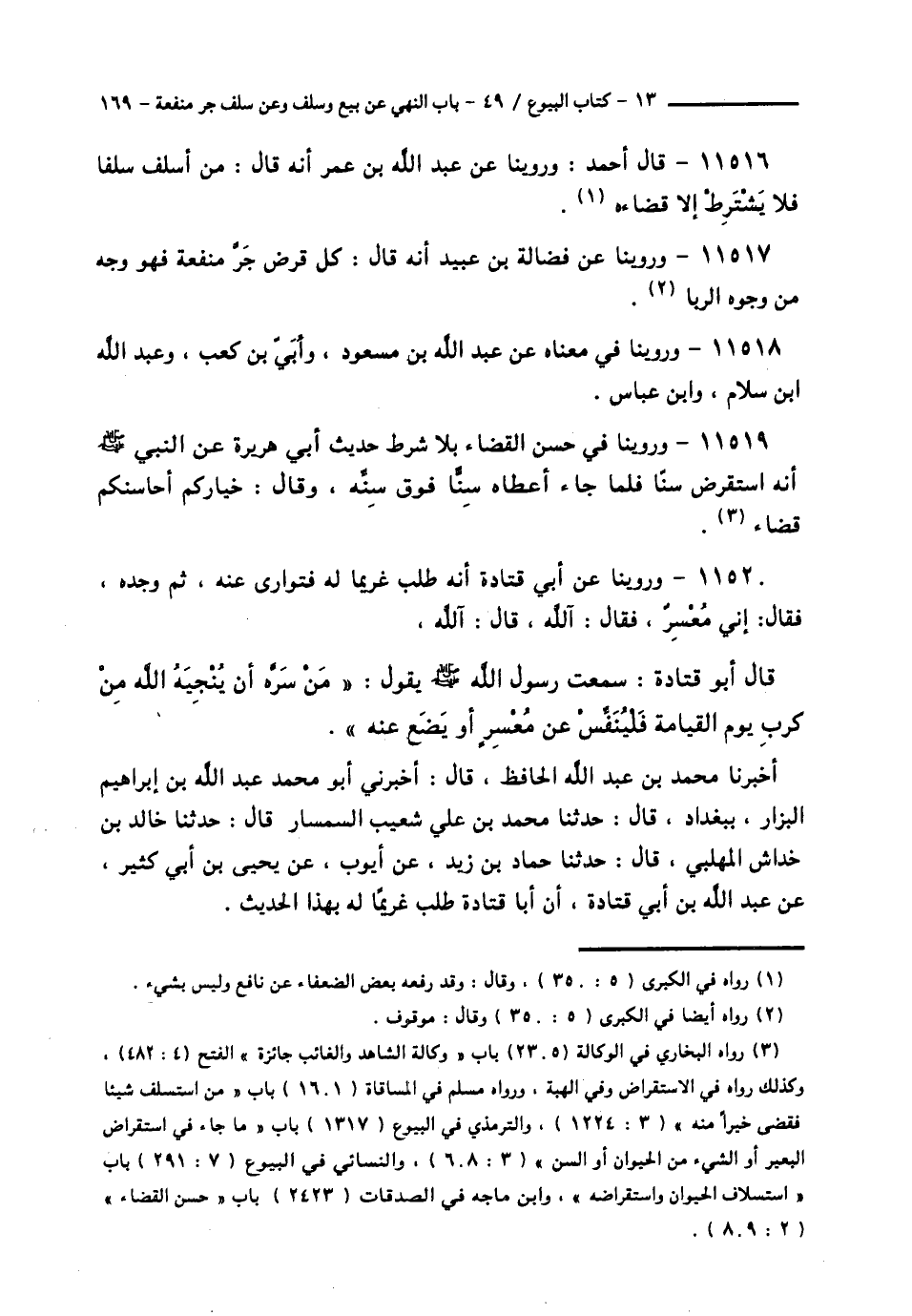 11520 - وَرُوِّينَا، عَنْ أَبِي قَتَادَةَ، أَنَّهُ طَلَبَ غَرِيمًا لَهُ فَتَوَارَى عَنْهُ، ثُمَّ وَجَدَهُ، فَقَالَ: إِنِّي مُعْسِرٌ، فَقَالَ: آللَّهِ قَالَ: آللَّهِ قَالَ أَبُو قَتَادَةَ: سَمِعْتُ رَسُولَ اللَّهِ صَلَّى اللهُ عَلَيْهِ وَسَلَّمَ يَقُولُ: § «مَنْ سَرَّهُ أَنْ يُنَجِّيَهُ اللَّهُ مِنْ كُرَبِ يَوْمِ الْقِيَامَةِ فَلْيُنَفِّسْ عَنْ مُعْسِرٍ أَوْ يَضَعْ عَنْهُ». أَخْبَرَنَا مُحَمَّدُ بْنُ عَبْدِ اللَّهِ الْحَافِظُ قَالَ: أَخْبَرَنِي أَبُو مُحَمَّدٍ عَبْدُ اللَّهِ بْنِ إِبْرَاهِيمَ الْبَزَّارُ بِبَغْدَادَ قَالَ: حَدَّثَنَا مُحَمَّدُ بْنُ عَلِيِّ بْنِ شُعَيْبٍ السِّمْسَارُ قَالَ: حَدَّثَنَا خَالِدُ بْنُ خِدَاشٍ الْمُهَلَّبِيُّ قَالَ: حَدَّثَنَا حَمَّادُ بْنُ زَيْدٍ، عَنْ يَحْيَى بْنِ أَبِي كَثِيرٍ، عَنْ عَبْدِ اللَّهِ بْنِ أَبِي قَتَادَةَ، أَنَّ أَبَا قَتَادَةَ طَلَبَ غَرِيمًا لَهُ، بِهَذَا الْحَدِيثِ -[170]-. رَوَاهُ مُسْلِمٌ فِي الصَّحِيحِ، عَنْ خَالِدِ بْنِ خِدَاشٍ