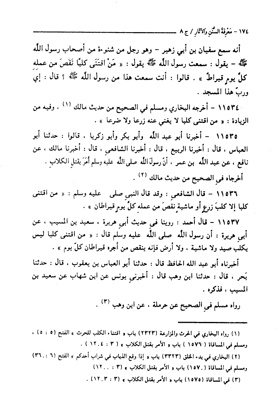 11536 - قَالَ الشَّافِعِيُّ: وَقَدْ قَالَ النَّبِيُّ صَلَّى اللهُ عَلَيْهِ وَسَلَّمَ: § «مَنِ اقْتَنَى كَلْبًا إِلَّا كَلْبَ زَرْعٍ أَوْ مَاشِيَةٍ نَقَصَ مِنْ عَمَلِهِ كُلَّ يَوْمٍ قِيرَاطَانِ»