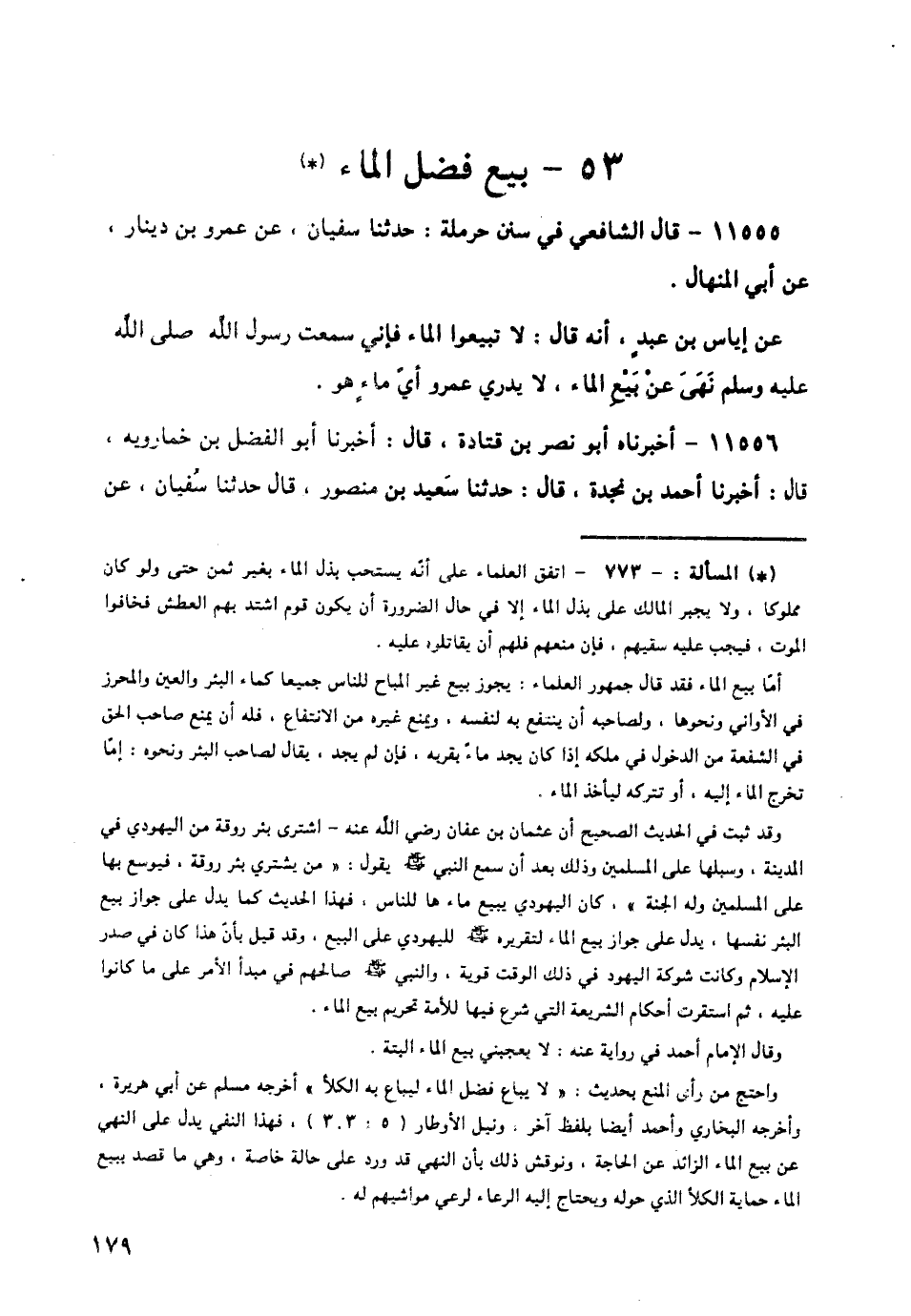 11559 - قَالَ الشَّافِعِيُّ: مَعْنَى الْحَدِيثِ، وَاللَّهُ أَعْلَمُ، أَنْ يُبَاعَ الْمَاءُ فِي الْمَوْضِعِ الَّذِي خَلْقَهُ اللَّهُ عَزَّ وَجَلَّ فِيهِ، وَذَلِكَ أَنْ يَأْتِيَ بِالْبَادِيَةِ الرَّجُلُ لَهُ الْبِئْرُ لِيَسْقِيَ بِهَا مَاشِيَتَهُ، وَيَكُونَ فِي مَائِهَا فَضْلٌ عَنْ مَاءِ مَاشِيَتِهِ، فَنَهَى رَسُولُ اللَّهِ صَلَّى اللهُ عَلَيْهِ وَسَلَّمَ مَالِكَ الْمَاءِ عَنْ بَيْعِ ذَلِكَ الْفَضْلِ، وَنَهَاهُ عَنْ مَنْعِهِ؛ لِأَنَّ فِي مَنْعِهِ أَنْ يَسْقِيَ مَاشِيَتَهُ مَنْعًا لِلْكَلَأِ الَّذِي لَا يَمْلِكُ، وَبَسَطَ الْكَلَامَ فِي شَرْحِهِ