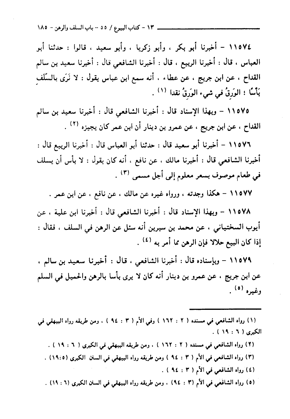 11574 - أَخْبَرَنَا أَبُو بَكْرٍ، وَأَبُو زَكَرِيَّا، وَأَبُو سَعِيدٍ، قَالُوا: حَدَّثَنَا أَبُو الْعَبَّاسِ قَالَ: أَخْبَرَنَا الرَّبِيعُ قَالَ: أَخْبَرَنَا الشَّافِعِيُّ قَالَ: أَخْبَرَنَا سَعِيدُ بْنُ سَالِمٍ الْقَدَّاحُ، عَنْ ابن جريج عَنْ عَطَاءٍ، أَنَّهُ سَمِعَ ابْنَ عَبَّاسٍ، يَقُولُ: «§لَا نَرَى بِالسَّلَفِ بَأْسًا، الْوَرِقُ فِي شَيْءٍ، الْوَرِقُ نَقْدًا».