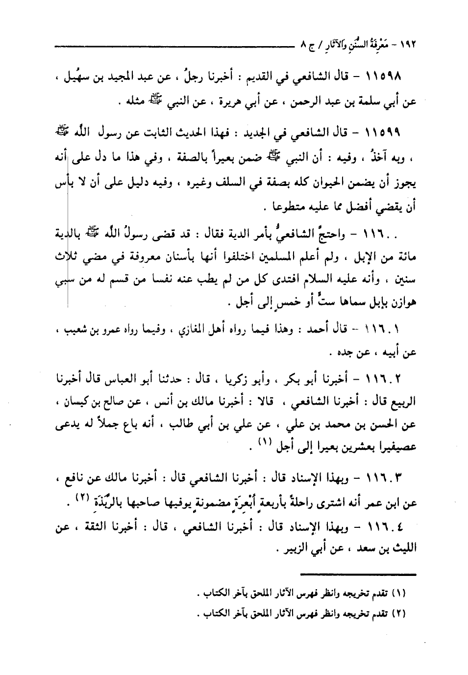 11603 - وَبِهَذَا الْإِسْنَادِ قَالَ: أَخْبَرَنَا الشَّافِعِيُّ قَالَ: أَخْبَرَنَا مَالِكٌ، عَنْ نَافِعٍ، عَنِ ابْنِ عُمَرَ: «أَنَّهُ §اشْتَرَى رَاحِلَةً بِأَرْبَعَةِ أَبْعِرَةٍ مَضْمُونَةٍ يُوَفِّيهَا صَاحِبَهَا بِالرَّبَذَةِ»