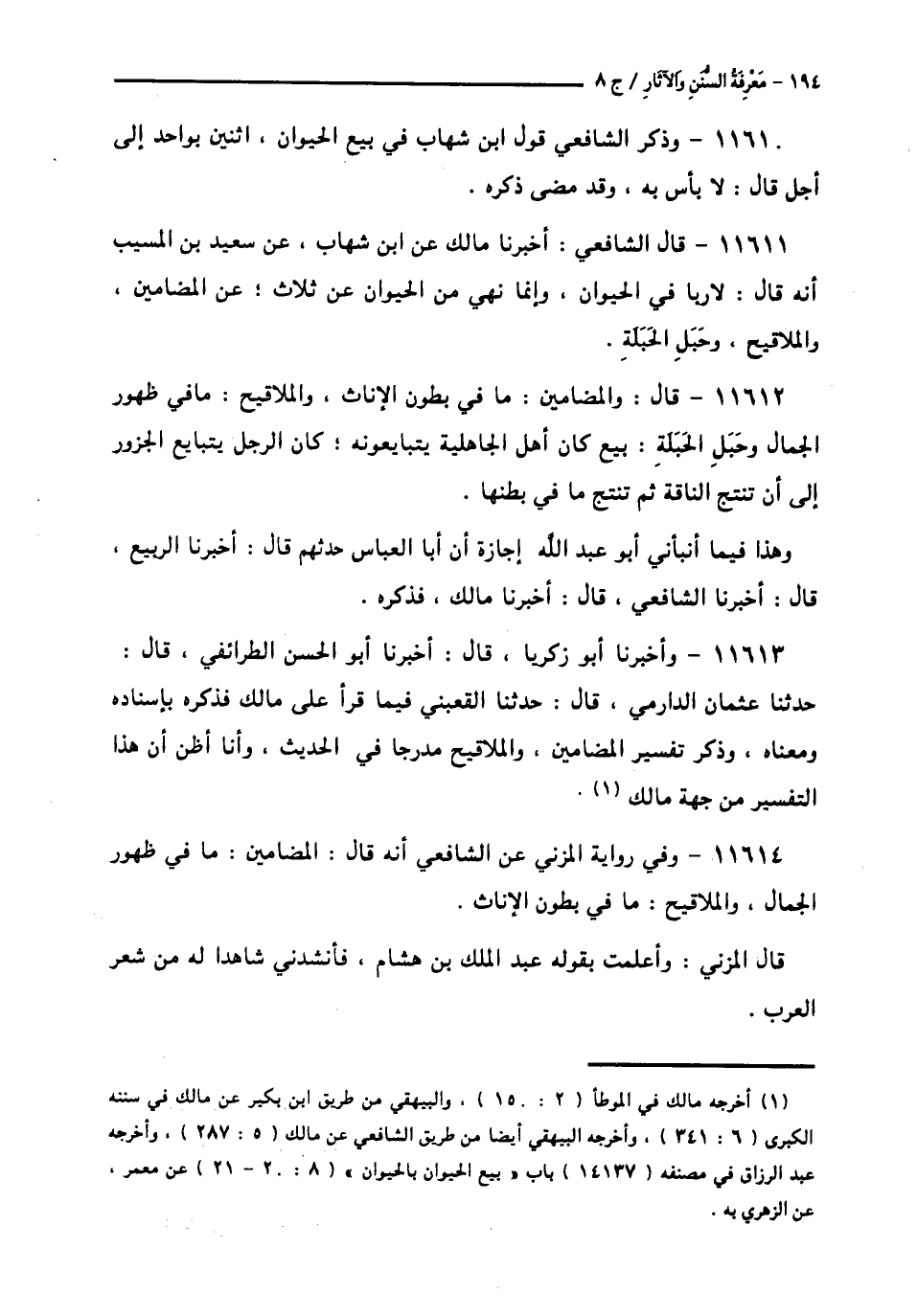 11611 - قَالَ الشَّافِعِيُّ: أَخْبَرَنَا مَالِكٌ، عَنِ ابْنِ شِهَابٍ، عَنْ سَعِيدِ بْنِ الْمُسَيِّبِ، أَنَّهُ قَالَ: «§لَا رِبًا فِي الْحَيَوَانِ، وَإِنَّمَا نُهِيَ مِنَ الْحَيَوَانِ عَنْ ثَلَاثٍ، عَنِ الْمَضَامِينَ، وَالْمَلَاقِيحِ، وَحَبَلِ الْحَبَلَةِ».