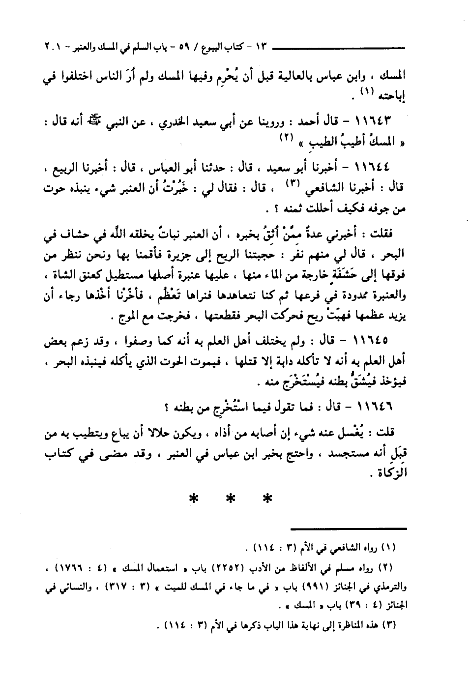 11644 - أَخْبَرَنَا أَبُو سَعِيدٍ قَالَ: حَدَّثَنَا أَبُو الْعَبَّاسِ قَالَ: أَخْبَرَنَا الرَّبِيعُ قَالَ: أَخْبَرَنَا الشَّافِعِيُّ قَالَ: فَقَالَ لِي: خَبُرْتُ أَنَّ §الْعَنْبَرَ شَيْءٌ يَنْبُذُهُ حُوتٌ مِنْ جَوْفِهِ فَكَيْفَ أَحْلَلْتَ ثَمَنَهُ؟. فَقُلْتُ: أَخْبَرَنِي عِدَّةٌ مِمَّنْ أَثِقُ بِخَبَرِهِ، أَنَّ الْعَنْبَرَ نَبَاتٌ يَخْلُقَهُ اللَّهُ فِي حِشَافٍ فِي الْبَحْرِ قَالَ لِي مِنْهُمْ نَفَرٌ: حَجَبَتْنَا الرِّيحُ إِلَى جَزِيرَةٍ فَأَقَمْنَا بِهَا وَنَحْنُ نَنْظُرُ مِنْ فَوْقِهَا إِلَى حَشَفَةٍ خَارِجَةٍ مِنَ الْمَاءِ مِنْهَا، عَلَيْهَا عَنْبَرَةٌ أَصْلُهَا مُسْتَطِيلٌ كَعُنُقِ الشَّاةِ، وَالْعَنْبَرَةُ مَمْدُودَةٌ فِي فَرْعِهَا، ثُمَّ كُنَّا نَتَعَاهَدُهَا فَنَرَاهَا تَعْظُمُ، فَأَخَّرْنَا أَخْذَهَا رَجَاءَ أَنْ يَزِيدَ عِظَمُهَا، فَهَبَّتْ رِيحٌ فَحَرَّكَتِ الْبَحْرَ فَقَطَعْتُهَا، فَخَرَجَتْ مَعَ الْمَوْجِ