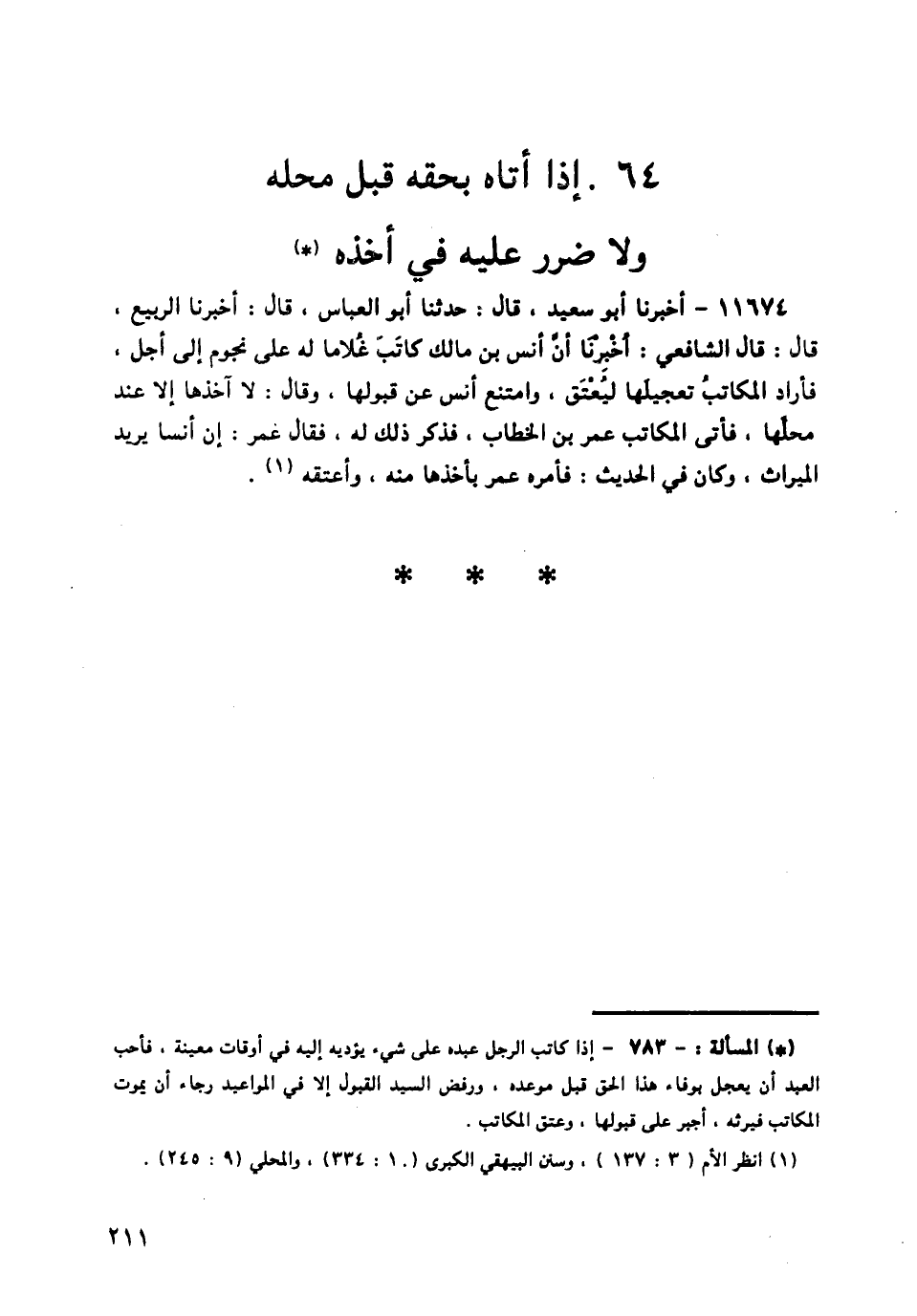 11674 - أَخْبَرَنَا أَبُو سَعِيدٍ قَالَ: حَدَّثَنَا أَبُو الْعَبَّاسِ قَالَ: أَخْبَرَنَا الرَّبِيعُ قَالَ: قَالَ الشَّافِعِيُّ: أُخْبِرْنَا أَنَّ أَنَسَ بْنَ مَالِكٍ كَاتَبَ غُلَامًا لَهُ عَلَى نُجُومٍ إِلَى أَجَلٍ، فَأَرَادَ الْمُكَاتَبُ تَعْجِيلِهَا لِيُعْتَقَ، وَامْتَنَعَ أَنَسٌ عَنْ قَبُولِهَا، وَقَالَ: لَا آخُذُهَا إِلَّا عِنْدَ مَحِلِّهَا، فَأَتَى الْمُكَاتَبُ عُمَرَ بْنَ الْخَطَّابِ، فَذَكَرَ ذَلِكَ لَهُ، فَقَالَ عُمَرُ: «§إِنَّ أَنَسًا يُرِيدُ الْمِيرَاثَ»، وَكَانَ فِي الْحَدِيثِ: فَأَمَرَهُ عُمَرُ بِأَخْذِهَا مِنْهُ، وَأَعْتَقَهُ "