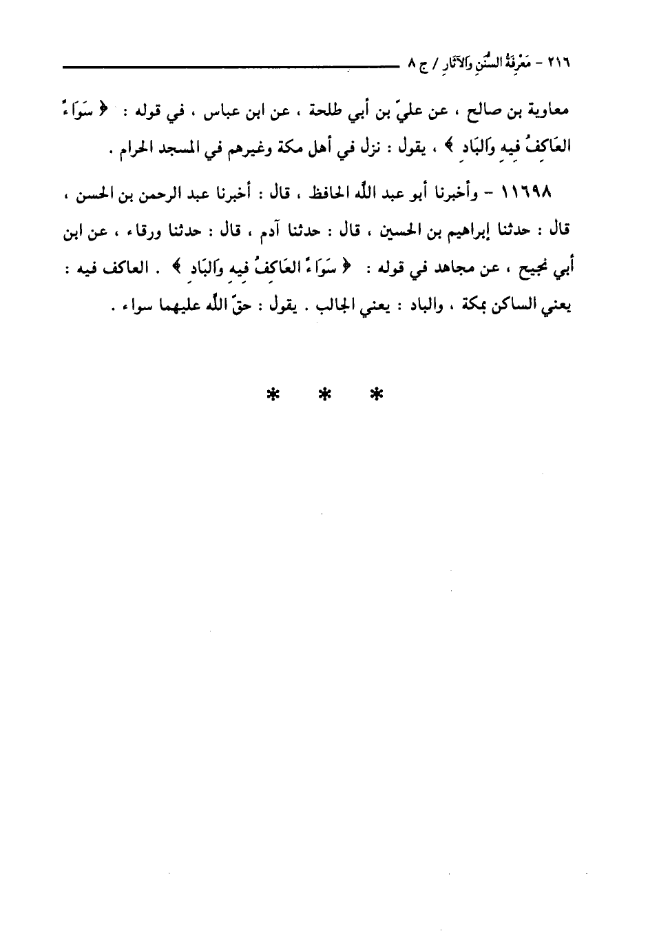 11698 - وَأَخْبَرَنَا أَبُو عَبْدِ اللَّهِ الْحَافِظُ قَالَ: أَخْبَرَنَا عَبْدُ الرَّحْمَنِ بْنُ الْحَسَنِ قَالَ: حَدَّثَنَا إِبْرَاهِيمُ بْنُ الْحُسَيْنِ قَالَ: حَدَّثَنَا آدَمُ قَالَ: حَدَّثَنَا وَرْقَاءُ، عَنِ ابْنِ أَبِي نَجِيحٍ، عَنْ مُجَاهِدٍ فِي قَوْلِهِ: " {§سَوَاءً الْعَاكِفُ فِيهِ وَالْبَادِ} [الحج: 25]: " الْعَاكِفُ فِيهِ: يَعْنِي السَّاكِنَ بِمَكَّةَ، وَالْبَادِ: يَعْنِي الْجَالِبَ. يَقُولُ: حَقُّ اللَّهِ عَلَيْهِمَا سَوَاءٌ "