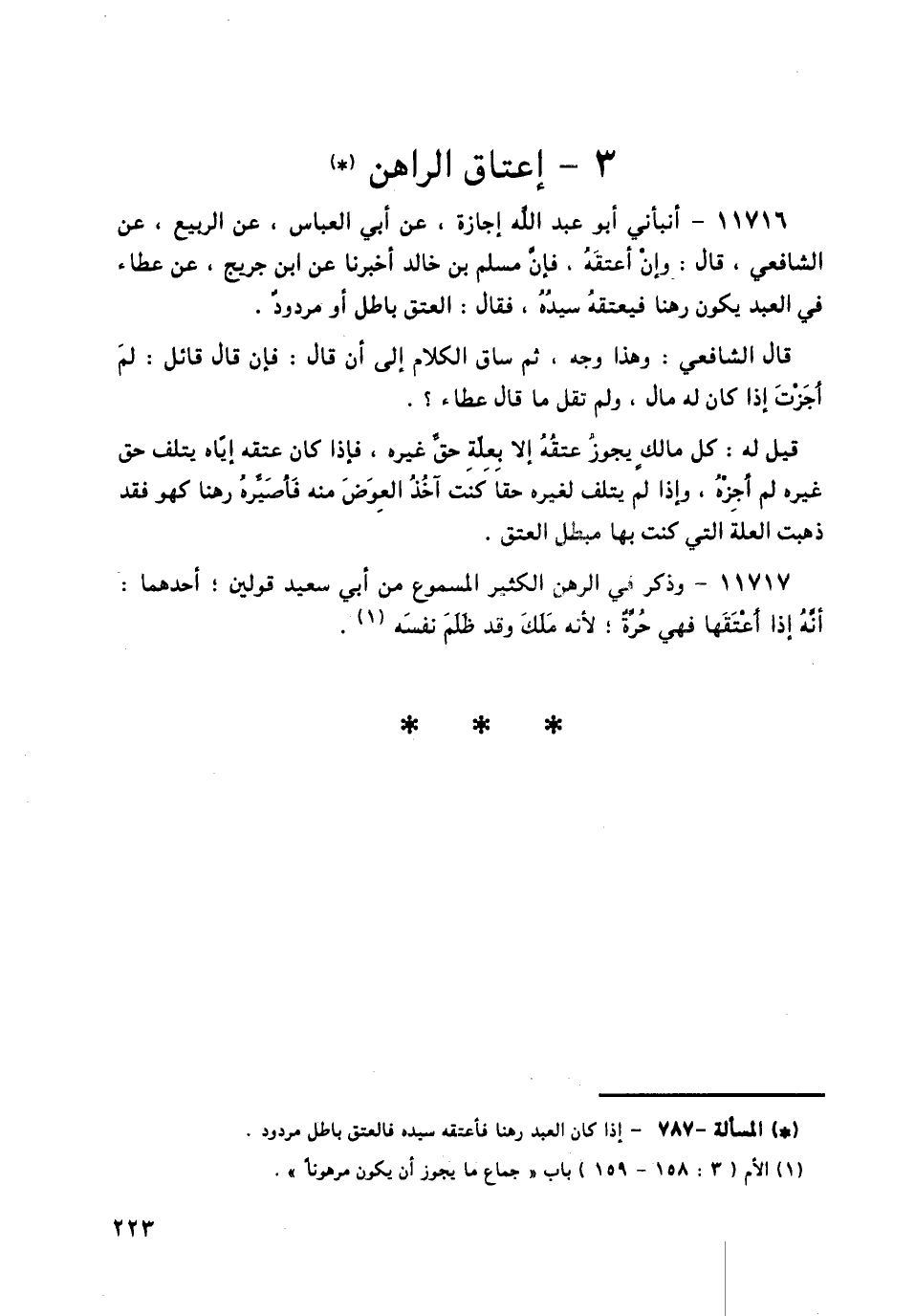 11716 - أَنْبَأَنِي أَبُو عَبْدِ اللَّهِ، إِجَازَةً، عَنْ أَبِي الْعَبَّاسِ، عَنِ الرَّبِيعِ، عَنِ الشَّافِعِيِّ قَالَ: وَإِنْ أَعْتَقَهُ، فَإِنَّ مُسْلِمَ بْنَ خَالِدٍ أَخْبَرَنَا، عَنِ ابْنِ جُرَيْجٍ، عَنْ عَطَاءٍ فِي الْعَبْدِ يَكُونُ رَهْنًا فَيُعْتِقُهُ سَيِّدُهُ، فَقَالَ: «§الْعِتْقُ بَاطِلٌ أَوْ مَرْدُودٌ». قَالَ الشَّافِعِيُّ: وَهَذَا وَجْهٌ، ثُمَّ سَاقَ الْكَلَامَ إِلَى أَنْ قَالَ: فَإِنْ قَالَ قَائِلٌ: لِمَ أَجَزْتَ إِذَا كَانَ لَهُ مَالٌ، وَلَمْ تَقُلْ مَا قَالَ عَطَاءٌ؟ قِيلَ لَهُ: كُلُّ مَالِكٍ يَجُوزُ عِتْقُهُ إِلَّا بِعِلَّةِ حَقِّ غَيْرِهِ، فَإِذَا كَانَ عِتْقُهُ إِيَّاهُ يُتْلِفُ حَقَّ غَيْرِهِ لَمْ أُجِزْهُ، وَإِذَا لَمْ يُتْلِفْ لِغَيْرِهِ حَقًّا كُنْتُ آخُذُ الْعِوَضَ مِنْهُ فَأُصَيِّرَهُ رَهْنًا كَهُوَ فَقَدْ ذَهَبَتِ الْعِلَّةُ الَّتِي كُنْتُ بِهَا مُبْطِلَ الْعِتْقِ،