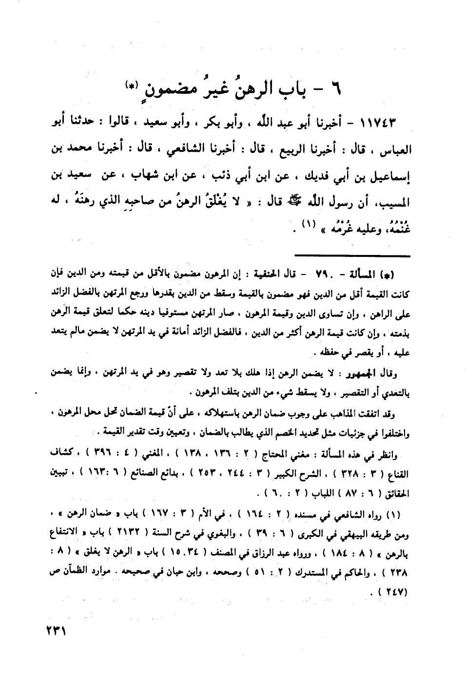 11743 - أَخْبَرَنَا أَبُو عَبْدِ اللَّهِ، وَأَبُو بَكْرٍ، وَأَبُو سَعِيدٍ، قَالُوا: حَدَّثَنَا أَبُو الْعَبَّاسِ قَالَ: أَخْبَرَنَا الرَّبِيعُ قَالَ: أَخْبَرَنَا الشَّافِعِيُّ قَالَ: أَخْبَرَنَا مُحَمَّدُ بْنُ إِسْمَاعِيلَ بْنِ أَبِي فُدَيْكٍ، عَنِ ابْنِ أَبِي ذِئْبٍ، عَنِ ابْنِ شِهَابٍ، عَنْ سَعِيدِ بْنِ الْمُسَيِّبِ، أَنَّ رَسُولَ اللَّهِ صَلَّى اللهُ عَلَيْهِ وَسَلَّمَ قَالَ: «§لَا يَغْلَقُ الرَّهْنُ مِنْ صَاحِبِهِ الَّذِي رَهَنَهُ، لَهُ غُنْمُهُ، وَعَلَيْهِ غُرْمُهُ» -[232]-.