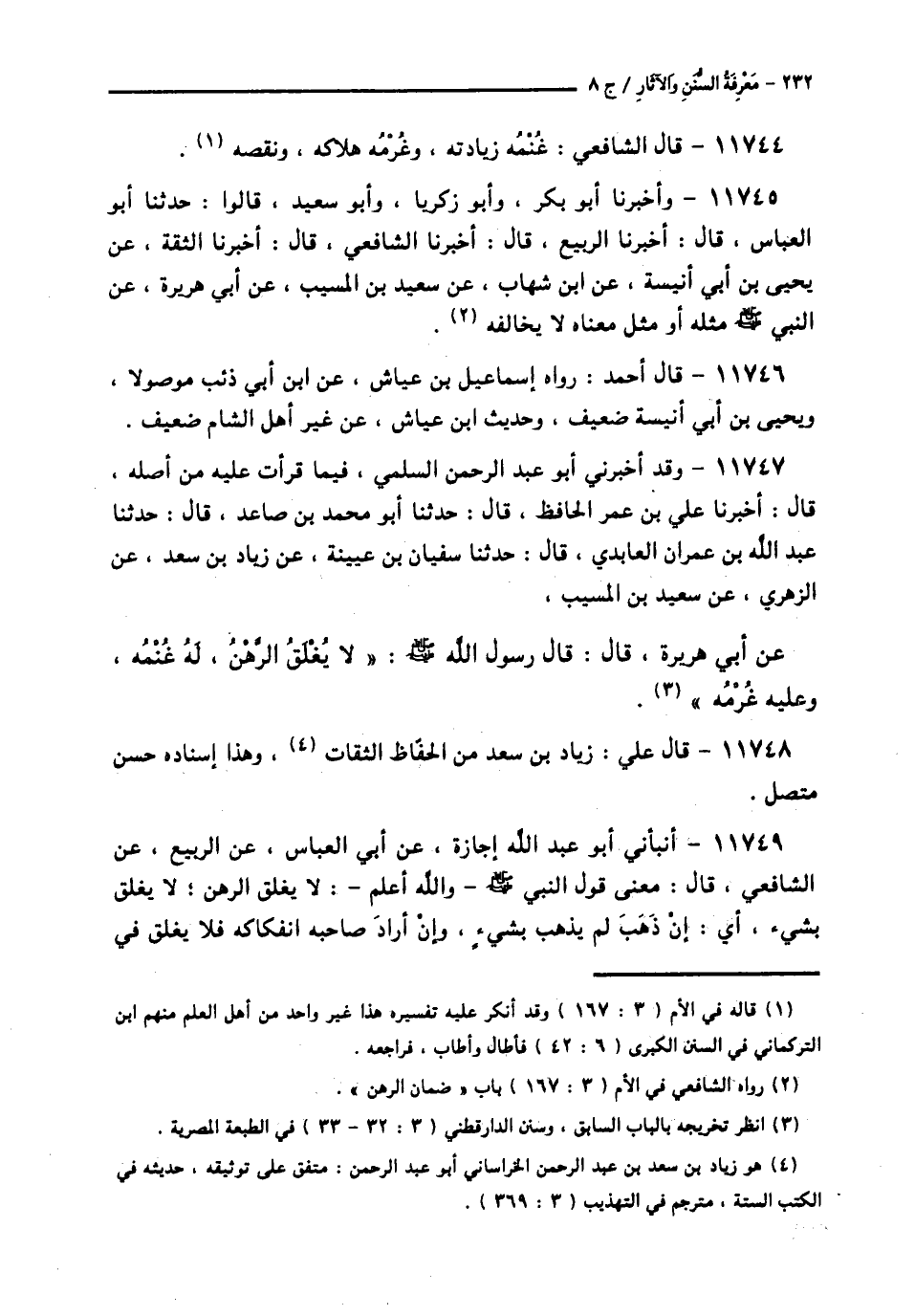 11747 - وَقَدْ أَخْبَرَنِي أَبُو عَبْدِ الرَّحْمَنِ السُّلَمِيُّ، فِيمَا قَرَأْتُ عَلَيْهِ مِنْ أَصْلِهِ قَالَ: أَخْبَرَنَا عَلِيُّ بْنُ عُمَرَ الْحَافِظُ قَالَ: حَدَّثَنَا أَبُو مُحَمَّدِ بْنُ صَاعِدٍ قَالَ: حَدَّثَنَا عَبْدُ اللَّهِ بْنُ عِمْرَانَ الْعَابِدِيُّ قَالَ: حَدَّثَنَا سُفْيَانُ بْنُ عُيَيْنَةَ، عَنْ زِيَادِ بْنِ سَعْدٍ، عَنِ الزُّهْرِيِّ، عَنْ سَعِيدِ بْنِ الْمُسَيِّبِ، عَنْ أَبِي هُرَيْرَةَ قَالَ: قَالَ رَسُولُ اللَّهِ صَلَّى اللهُ عَلَيْهِ وَسَلَّمَ: «§لَا يَغْلَقُ الرَّهْنُ، لَهُ غُنْمُهُ، وَعَلَيْهِ غُرْمُهُ».