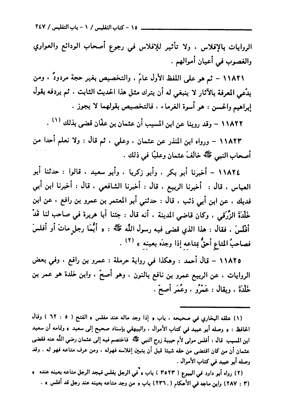 11824 - أَخْبَرَنَا أَبُو بَكْرٍ، وَأَبُو زَكَرِيَّا، وَأَبُو سَعِيدٍ، قَالُوا: حَدَّثَنَا أَبُو الْعَبَّاسِ قَالَ: أَخْبَرَنَا الرَّبِيعُ قَالَ: أَخْبَرَنَا الشَّافِعِيُّ قَالَ: أَخْبَرَنَا ابْنُ أَبِي فُدَيْكٍ، عَنِ ابْنِ أَبِي ذِئْبٍ قَالَ: حَدَّثَنِي أَبُو الْمُعْتَمِرِ بْنُ عَمْرِو بْنِ رَافِعٍ، عَنِ ابْنِ خَلْدَةَ الزُّرَقِيِّ، وَكَانَ قَاضِي الْمَدِينَةِ، أَنَّهُ قَالَ: جِئْنَا أَبَا هُرَيْرَةَ فِي صَاحِبٍ لَنَا قَدْ أَفْلَسَ، فَقَالَ: هَذَا الَّذِي قَضَى فِيهِ رَسُولُ اللَّهِ صَلَّى اللهُ عَلَيْهِ وَسَلَّمَ: § «أَيُّمَا رَجُلٍ مَاتَ أَوْ أَفْلَسَ فَصَاحِبُ الْمَتَاعِ أَحَقُّ بِمَتَاعِهِ إِذَا وَجَدَهُ بِعَيْنِهِ».