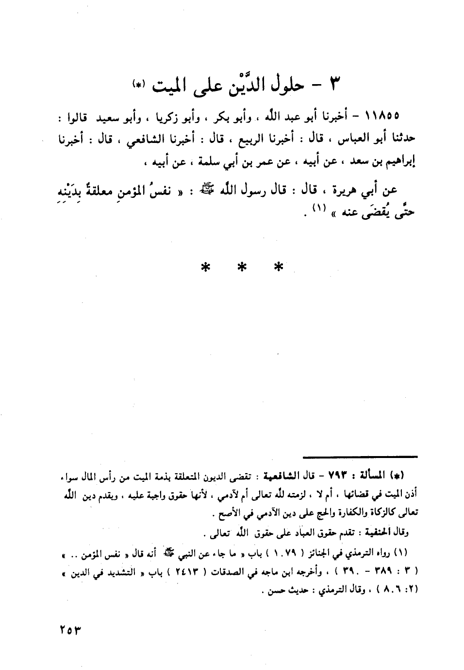 11855 - أَخْبَرَنَا أَبُو عَبْدِ اللَّهِ، وَأَبُو بَكْرٍ، وَأَبُو زَكَرِيَّا، وَأَبُو سَعِيدٍ قَالُوا: حَدَّثَنَا أَبُو الْعَبَّاسِ قَالَ: أَخْبَرَنَا الرَّبِيعُ قَالَ: أَخْبَرَنَا الشَّافِعِيُّ قَالَ: أَخْبَرَنَا إِبْرَاهِيمُ بْنُ سَعْدٍ، عَنْ أَبِيهِ، عَنْ عَمْرِو بْنِ أَبِي سَلَمَةَ، عَنْ أَبِيهِ، عَنْ أَبِي هُرَيْرَةَ قَالَ: قَالَ رَسُولُ اللَّهِ صَلَّى اللهُ عَلَيْهِ وَسَلَّمَ: § «نَفْسُ الْمُؤْمِنِ مُعَلَّقَةٌ بِدَيْنِهِ حَتَّى يُقْضَى عَنْهُ»