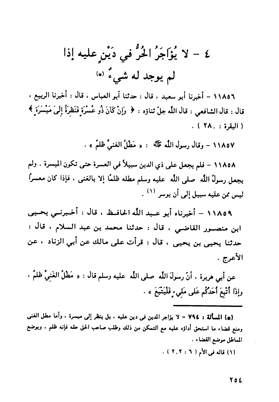 11858 - فَلَمْ يَجْعَلْ عَلَى ذِي الدَّيْنِ سَبِيلًا فِي الْعُسْرَةِ حَتَّى تَكُونَ الْمَيْسَرَةُ. وَلَمْ يَجْعَلْ رَسُولُ اللَّهِ صَلَّى اللهُ عَلَيْهِ وَسَلَّمَ، مَطْلَهُ ظَالِمًا إِلَّا بِالْغِنَى، فَإِذَا كَانَ مُعْسِرًا لَيْسَ مِمَّنْ عَلَيْهِ سَبِيلٌ إِلَى أَنْ يُوسِرَ