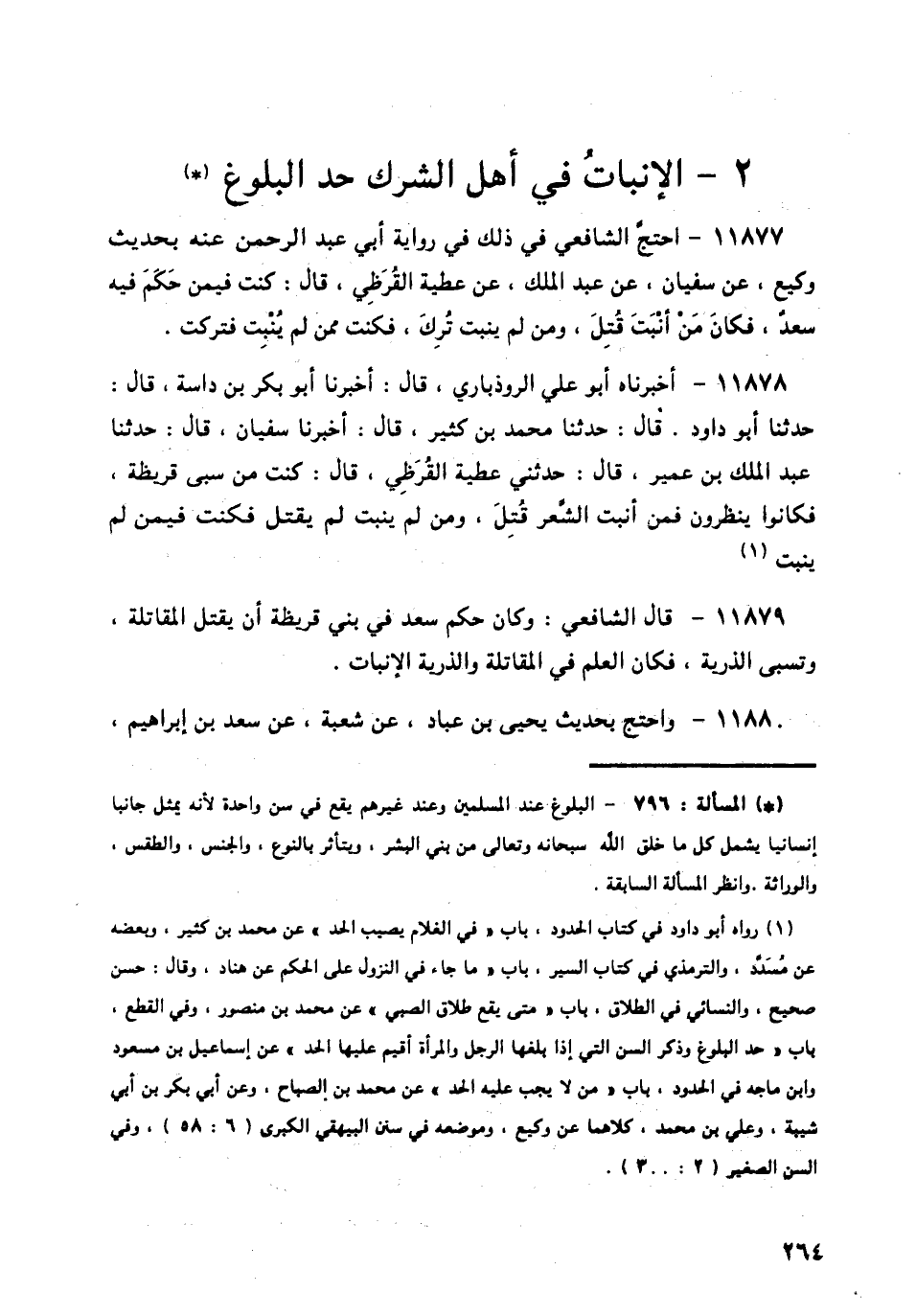 11879 - قَالَ الشَّافِعِيُّ: وَكَانَ حُكْمُ سَعْدٍ فِي بَنِي قُرَيْظَةَ: أَنْ يُقْتَلَ الْمُقَاتِلَةُ، وَتُسْبَى الذُّرِّيَّةُ. فَكَانَ الْعَلَمَ فِي الْمُقَاتِلَةِ وَالذُّرِّيَّةِ الْإِنْبَاتُ