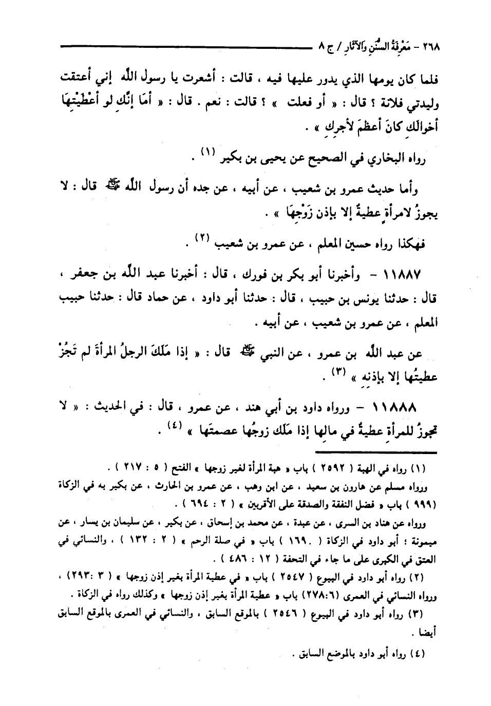 11888 - وَرَوَاهُ دَاوُدُ بْنُ أَبِي هِنْدٍ، عَنْ عَمْرٍو قَالَ: فِي الْحَدِيثِ: «لَا تَجُوزُ لِلْمَرْأَةِ عَطِيَّةٌ فِي مَالِهَا إِذَا مَلَكَ زَوْجُهَا عِصْمَتَهَا» -[269]-.