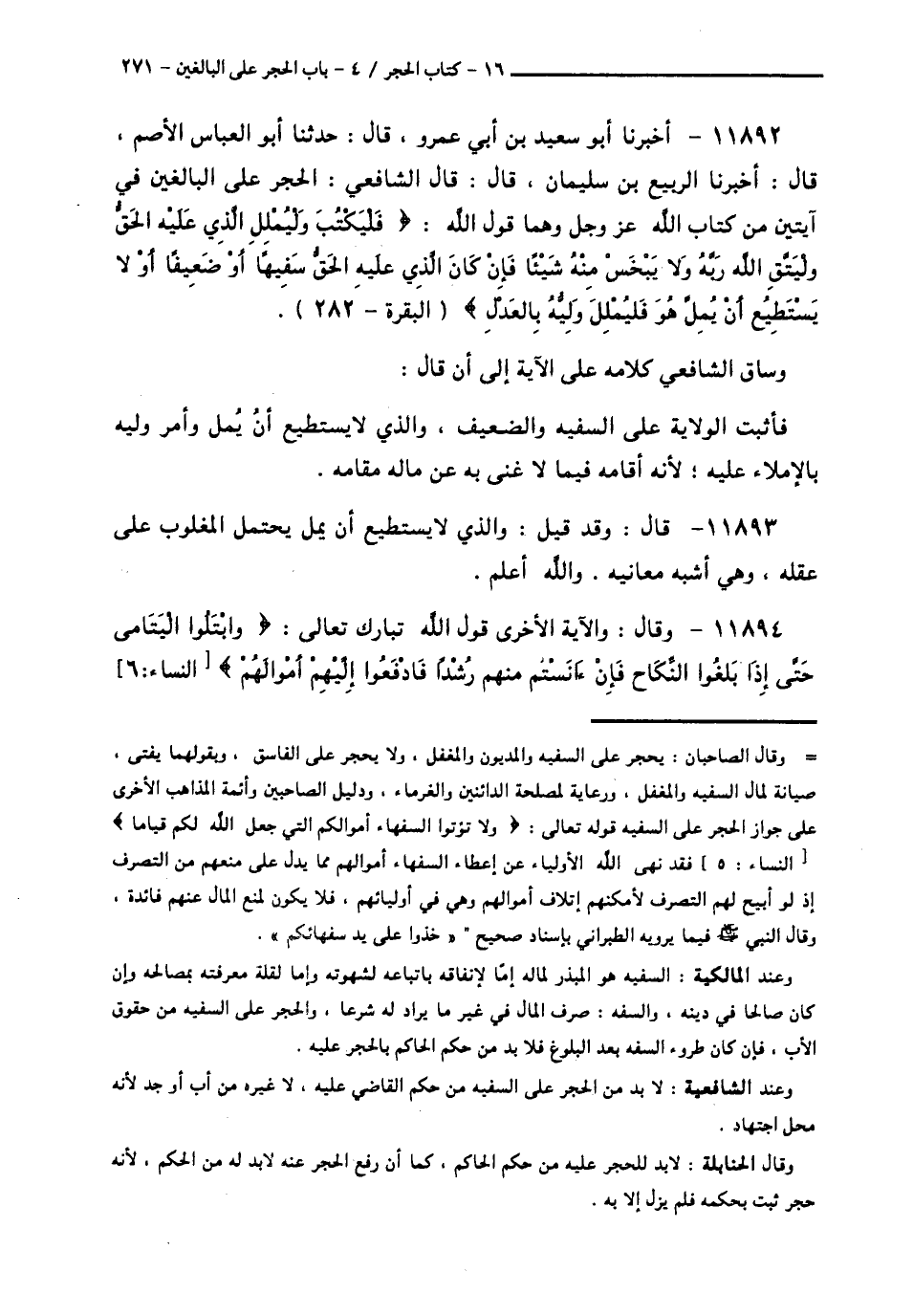 11892 - أَخْبَرَنَا أَبُو سَعِيدِ بْنُ أَبِي عَمْرٍو قَالَ: حَدَّثَنَا أَبُو الْعَبَّاسِ الْأَصَمُّ قَالَ: أَخْبَرَنَا الرَّبِيعُ بْنُ سُلَيْمَانَ قَالَ: قَالَ الشَّافِعِيُّ: §" الْحَجْرُ عَلَى الْبَالِغِينَ فِي آيَتَيْنِ مِنْ كِتَابِ اللَّهِ عَزَّ وَجَلَّ، وَهُمَا قَوْلُ اللَّهِ: {فَلْيَكْتُبْ وَلْيُمْلِلِ الَّذِي عَلَيْهِ الْحَقُّ، وَلْيَتَّقِ اللَّهَ رَبَّهُ، وَلَا يَبْخَسْ مِنْهُ شَيْئًا، فَإِنْ كَانَ الَّذِي عَلَيْهِ الْحَقُّ سَفِيهًا، أَوْ ضَعِيفًا، أَوْ لَا يَسْتَطِيعُ أَنْ يُمِلَّ هُوَ فَلْيُمْلِلْ وَلِيُّهُ بِالْعَدْلِ} [البقرة: 282] ". وَسَاقَ الشَّافِعِيُّ كَلَامَهُ عَلَى الْآيَةِ إِلَى أَنْ قَالَ: فَأَثْبَتَ الْوَلَايَةَ عَلَى السَّفِيهِ وَالضَّعِيفِ، وَالَّذِي لَا يَسْتَطِيعُ أَنْ يُمِلَّ وَأَمَرَ وَلِيَّهُ بِالْإِمْلَاءِ عَلَيْهِ؛ لِأَنَّهُ أَقَامَهُ فِيمَا لَا غِنًى بِهِ عَنْ مَالِهِ مَقَامَهُ،