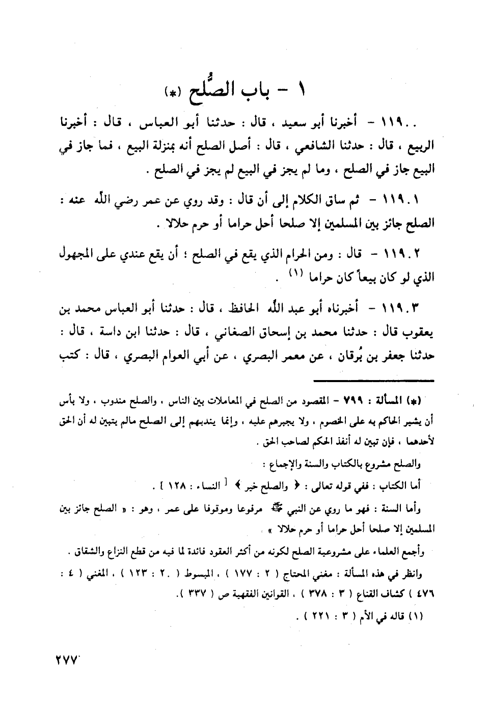 11903 - أَخْبَرَنَاهُ أَبُو عَبْدِ اللَّهِ الْحَافِظُ قَالَ: حَدَّثَنَا أَبُو الْعَبَّاسِ مُحَمَّدُ بْنُ يَعْقُوبَ قَالَ: حَدَّثَنَا مُحَمَّدُ بْنُ إِسْحَاقَ الصَّغَانِيُّ قَالَ: حَدَّثَنَا ابْنُ دَاسَةَ قَالَ: حَدَّثَنَا جَعْفَرُ بْنُ بُرْقَانَ، عَنْ مَعْمَرٍ الْبَصْرِيِّ، عَنْ أَبِي الْعَوَّامِ الْبَصْرِيِّ قَالَ: كَتَبَ -[278]- عُمَرُ إِلَى أَبِي مُوسَى الْأَشْعَرِيِّ، فَذَكَرَ الْحَدِيثَ، وَقَالَ فِيهِ: «§وَالصُّلْحُ جَائِزٌ بَيْنَ الْمُسْلِمِينَ، إِلَّا صُلْحًا أَحَلَّ حَرَامًا، أَوْ حَرَّمَ حَلَالًا».