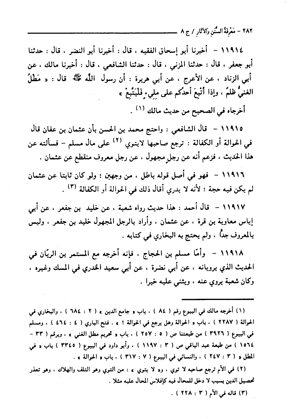 11914 - أَخْبَرَنَا أَبُو إِسْحَاقَ الْفَقِيهُ قَالَ: أَخْبَرَنَا أَبُو النَّضْرِ قَالَ: حَدَّثَنَا أَبُو جَعْفَرٍ قَالَ: حَدَّثَنَا الْمُزَنِيُّ قَالَ: حَدَّثَنَا الشَّافِعِيُّ قَالَ: أَخْبَرَنَا مَالِكُ، عَنْ أَبِي الزِّنَادِ، عَنِ الْأَعْرَجِ، عَنْ أَبِي هُرَيْرَةَ، أَنَّ رَسُولَ اللَّهِ صَلَّى اللهُ عَلَيْهِ وَسَلَّمَ قَالَ: «§مَطْلُ الْغَنِيِّ ظُلْمٌ، وَإِذَا أُتْبِعَ أَحَدُكُمْ عَلَى مَلِيءٍ فَلْيَتْبَعْ». أَخْرَجَاهُ فِي الصَّحِيحِ مِنْ حَدِيثِ مَالِكٍ