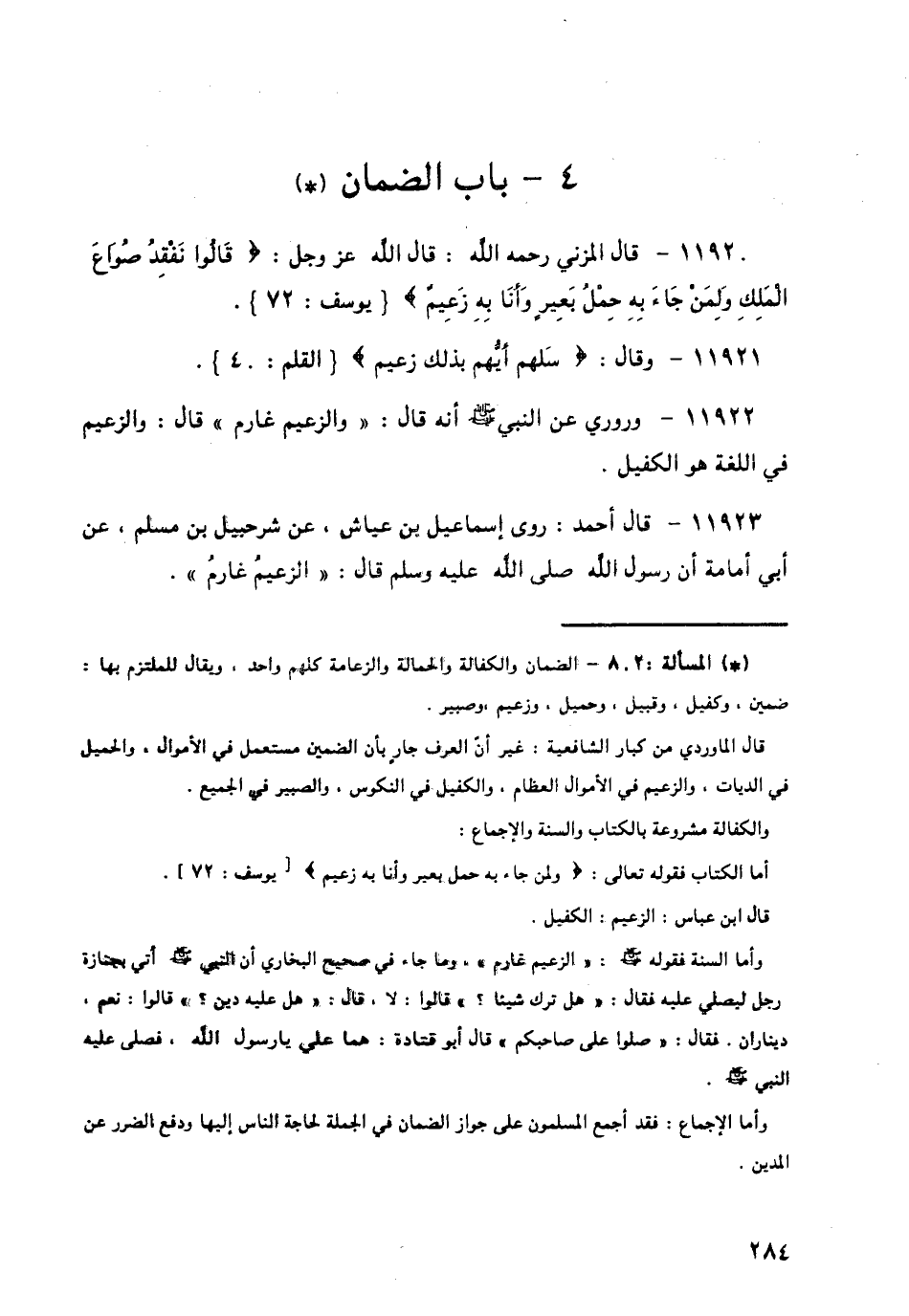 11920 - قَالَ الْمُزَنِيُّ رَحِمَهُ اللَّهُ: قَالَ اللَّهُ عَزَّ وَجَلَّ: {قَالُوا نَفْقِدُ صُوَاعَ الْمَلِكِ وَلِمَنْ جَاءَ بِهِ حِمْلُ بَعِيرٍ وَأَنَا بِهِ زَعِيمٌ} [يوسف: 72]،