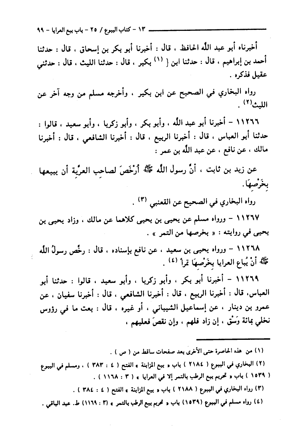 11266 - أَخْبَرَنَا أَبُو عَبْدِ اللَّهِ، وَأَبُو بَكْرٍ، وَأَبُو زَكَرِيَّا، وَأَبُو سَعِيدٍ، قَالُوا: حَدَّثَنَا أَبُو الْعَبَّاسِ قَالَ: أَخْبَرَنَا الرَّبِيعُ قَالَ: أَخْبَرَنَا الشَّافِعِيُّ قَالَ: أَخْبَرَنَا مَالِكٌ، عَنْ نَافِعٍ، عَنْ عَبْدِ اللَّهِ بْنِ عُمَرَ، عَنْ زَيْدِ بْنِ ثَابِتٍ، أَنَّ رَسُولَ اللَّهِ صَلَّى اللهُ عَلَيْهِ وَسَلَّمَ: § «أَرْخَصَ لِصَاحِبِ الْعَرِيَّةِ أَنْ يَبِيعَهَا بِخَرْصِهَا». رَوَاهُ الْبُخَارِيُّ فِي الصَّحِيحِ، عَنِ الْقَعْنَبِيِّ،