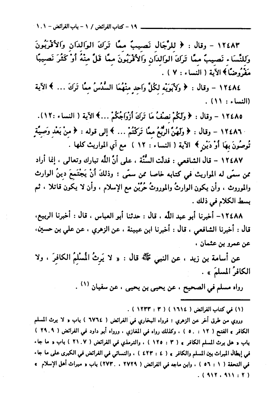 12488 - أَخْبَرَنَا أَبُو عَبْدِ اللَّهِ قَالَ: حَدَّثَنَا أَبُو الْعَبَّاسِ قَالَ: أَخْبَرَنَا الرَّبِيعُ قَالَ: أَخْبَرَنَا الشَّافِعِيُّ قَالَ: أَخْبَرَنَا ابْنُ عُيَيْنَةَ، عَنِ الزُّهْرِيِّ، عَنْ عَلِيِّ بْنِ حُسَيْنٍ، عَنْ عَمْرِو بْنِ عُثْمَانَ، عَنْ أُسَامَةَ بْنِ زَيْدٍ، عَنِ النَّبِيِّ صَلَّى اللهُ عَلَيْهِ وَسَلَّمَ قَالَ: «§لَا يَرِثُ الْمُسْلِمُ الْكَافِرَ، وَلَا الْكَافِرُ الْمُسْلِمَ». رَوَاهُ مُسْلِمٌ فِي الصَّحِيحِ، عَنْ يَحْيَى بْنِ يَحْيَى، عَنْ سُفْيَانَ.