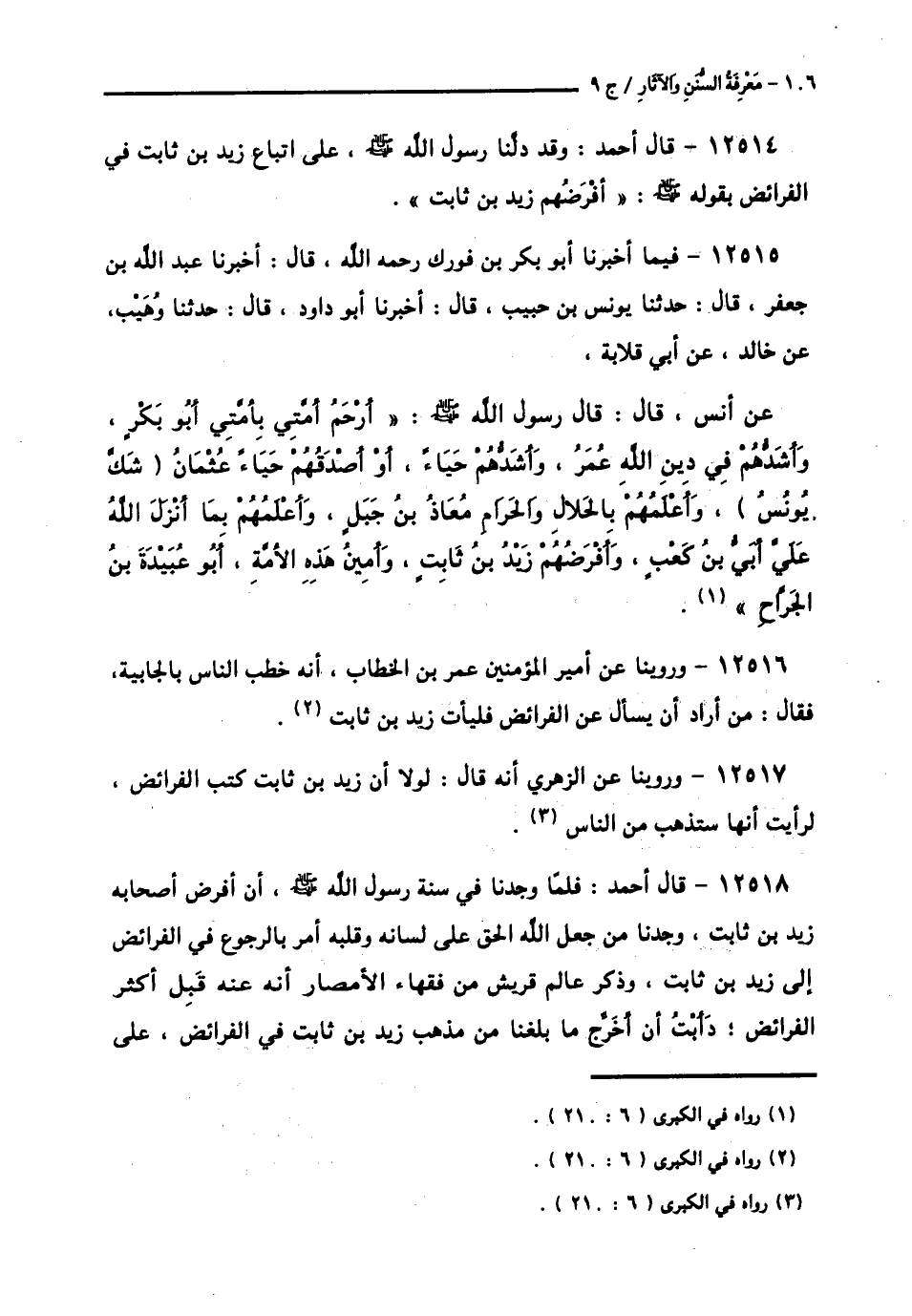 12518 - قَالَ أَحْمَدُ: فَلَمَّا وَجَدْنَا فِي سُنَّةِ رَسُولِ اللَّهِ صَلَّى اللهُ عَلَيْهِ وَسَلَّمَ أَنَّ أَفْرَضَ أَصْحَابِهِ زَيْدُ بْنُ ثَابِتٍ، وَجَدْنَا مَنْ جَعَلَ اللَّهُ الْحَقَّ عَلَى لِسَانِهِ وَقَلْبِهِ أُمِرَ بِالرُّجُوعِ فِي الْفَرَائِضِ إِلَى زَيْدِ بْنِ ثَابِتٍ، وَذَكَرَ عَالِمُ قُرَيْشٍ مِنْ فُقَهَاءِ الْأَمْصَارِ أَنَّهُ عَنْهُ قَبِلَ أَكْثَرَ الْفَرَائِضِ، دَأَبْتُ أَنْ أُخَرِّجَ مَا بَلَغَنَا مِنْ مَذْهَبِ زَيْدِ بْنِ ثَابِتٍ فِي الْفَرَائِضِ عَلَى -[107]- تَرْتِيبِ مَسَائِلِهَا فِي مُخْتَصَرِ الْمُزَنِيِّ رَحِمَهُ اللَّهُ، ثُمَّ شَوَاهِدِ قَوْلِهِ فِيمَا قَدْ أَخْرَجْنَاهَا فِي كِتَابِ السُّنَنِ، وَبِاللَّهِ التَّوْفِيقُ -[108]-، فَمِنْهَا:
