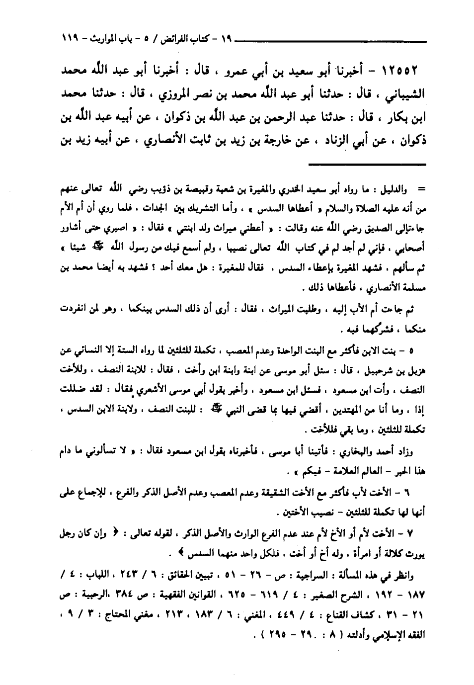 12552 - أَخْبَرَنَا أَبُو سَعِيدِ بْنُ أَبِي عَمْرٍو قَالَ: أَخْبَرَنَا أَبُو عَبْدِ اللَّهِ مُحَمَّدٌ الشَّيْبَانِيُّ قَالَ: حَدَّثَنَا أَبُو عَبْدِ اللَّهِ مُحَمَّدُ بْنُ نَصْرٍ الْمَرْوَزِيُّ قَالَ: حَدَّثَنَا مُحَمَّدُ بْنُ بَكَّارٍ قَالَ: حَدَّثَنَا عَبْدُ الرَّحْمَنِ بْنُ عَبْدِ اللَّهِ بْنِ ذَكْوَانَ، عَنْ أَبِيهِ عَبْدِ اللَّهِ بْنِ ذَكْوَانَ، عَنْ أَبِي الزِّنَادِ، عَنْ خَارِجَةَ بْنِ زَيْدِ بْنِ ثَابِتٍ الْأَنْصَارِيِّ، عَنْ أَبِيهِ زَيْدِ بْنِ -[120]- ثَابِتٍ، أَنَّ مَعَانِي هَذِهِ الْفَرَائِضِ وَأُصُولَهَا كُلَّهَا عَنْ زَيْدِ بْنِ ثَابِتٍ، وَأَمَّا التَّفْسِيرُ فَتَفْسِيرُ أَبِي الزِّنَادِ عَلَى مَعْنَى زَيْدِ بْنِ ثَابِتٍ قَالَ: