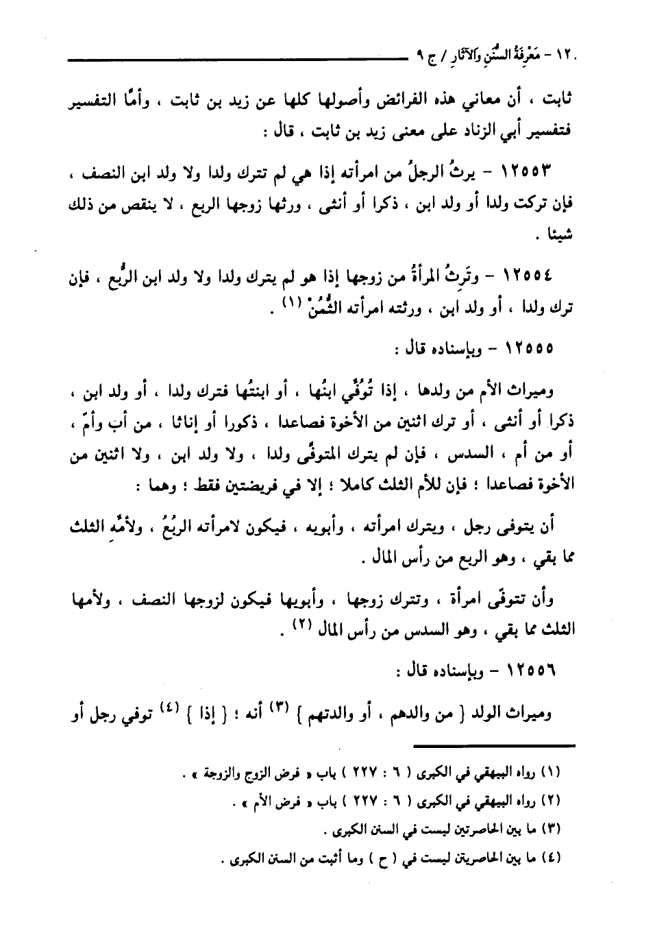 12555 - وَبِإِسْنَادِهِ قَالَ: «§وَمِيرَاثُ الْأُمِّ مِنْ وَلَدِهَا إِذَا تُوُفِّيَ ابْنُهَا، أَوْ ابْنَتُهَا فَتَرَكَ وَلَدًا، أَوْ وَلَدَ ابْنٍ ذَكَرًا أَوْ أُنْثَى، أَوْ تَرَكَ اثْنَيْنِ مِنَ الْأُخْوَةِ فَصَاعِدًا، ذُكُورًا أَوْ إِنَاثًا، مِنْ أَبٍ وَأُمٍّ أَوْ مِنْ أُمٍّ، السُّدُسُ، فَإِنْ لَمْ يَتْرُكِ الْمُتَوَفِّي وَلَدًا، وَلَا وَلَدَ ابْنٍ، وَلَا اثْنَيْنِ مِنَ الْأُخْوَةِ فَصَاعِدًا، فَإِنَّ لِلْأُمِّ الثُّلُثُ كَامِلًا، إِلَّا فِي فَرِيضَتَيْنِ فَقَطْ، وَهُمَا أَنْ يُتَوَفَّى رَجُلٌ، وَيَتْرُكَ امْرَأَتَهُ وَأَبَوَيْهِ، فَيَكُونُ لِامْرَأَتِهِ الرُّبُعُ، وَلِأُمِّهِ الثُّلُثُ مِمَّا بَقِيَ، وَهُوَ الرُّبُعُ مِنْ رَأْسِ الْمَالِ، وَأَنْ تُتَوَفَّى امْرَأَةٌ، وَتَتْرُكَ زَوْجَهَا، وَأَبَوَيْهَا فَيَكُونَ لِزَوْجِهَا النِّصْفُ، وَلِأُمِّهَا الثُّلُثُ مِمَّا بَقِيَ، وَهُوَ السُّدُسُ مِنْ رَأْسِ الْمَالِ»