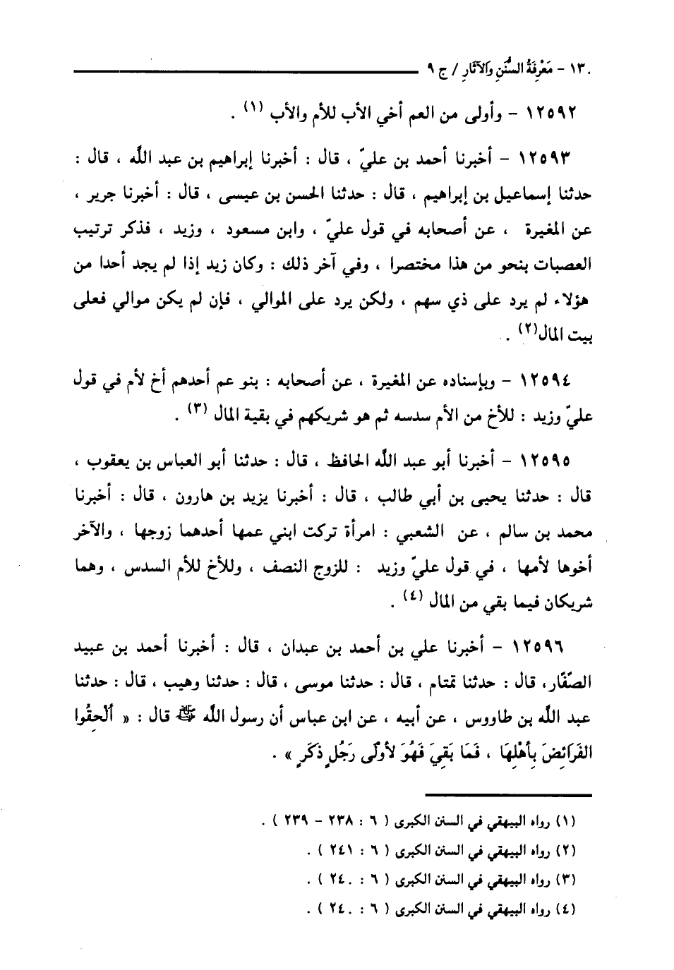 12593 - أَخْبَرَنَا أَحْمَدُ بْنُ عَلِيٍّ قَالَ: أَخْبَرَنَا إِبْرَاهِيمُ بْنُ عَبْدِ اللَّهِ قَالَ: حَدَّثَنَا إِسْمَاعِيلُ بْنُ إِبْرَاهِيمَ قَالَ: حَدَّثَنَا الْحَسَنُ بْنُ عِيسَى قَالَ: أَخْبَرَنَا جَرِيرٌ، عَنِ الْمُغِيرَةِ، عَنْ أَصْحَابِهِ فِي قَوْلِ عَلِيٍّ، وَابْنِ مَسْعُودٍ، وَزَيْدٍ، فَذَكَرَ تَرْتِيبَ الْعَصَبَاتِ بِنَحْوٍ مِنْ هَذَا مُخْتَصَرًا، وَفِي آخِرِ ذَلِكَ: § «وَكَانَ زَيْدٌ إِذَا لَمْ يَجِدْ أَحَدًا مِنْ هَؤُلَاءِ لَمْ يَرُدَّ عَلَى ذِي سَهْمٍ، وَلَكِنْ يَرُدُّ عَلَى الْمَوَالِي، فَإِنْ لَمْ يَكُنْ مَوَالِي فَعَلَى بَيْتِ الْمَالِ»