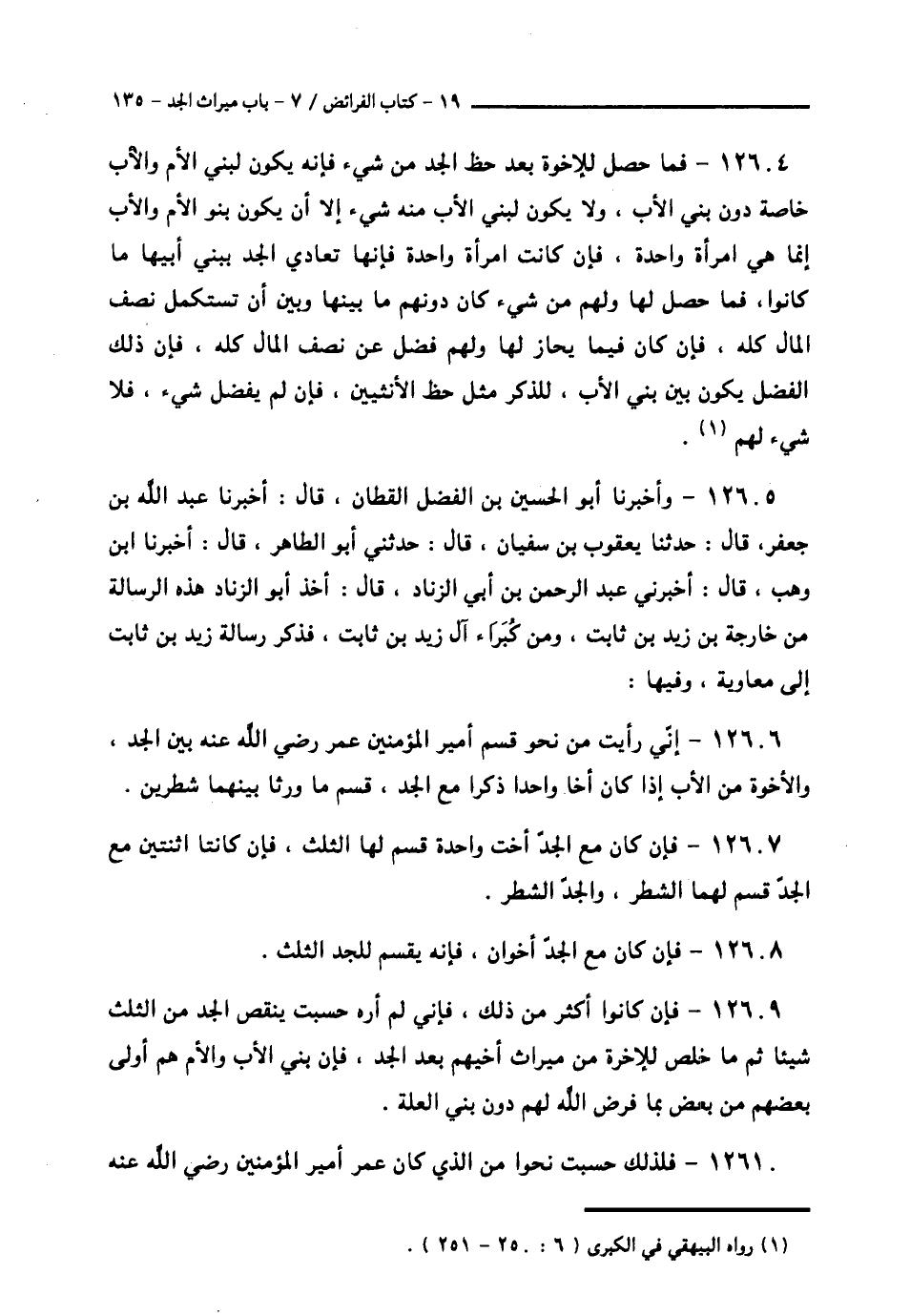 12610 - فَلِذَلِكَ حَسَبْتُ نَحْوًا مِنَ الَّذِي كَانَ عُمَرُ أَمِيرُ الْمُؤْمِنِينَ رَضِيَ اللَّهُ عَنْهُ -[136]- يَقْسِمُ بَيْنَ الْجَدِّ وَالْإِخْوَةِ مِنَ الْأَبِ، وَلَمْ يَكُنْ يُوَرِّثُ الْإِخْوَةَ مِنَ الْأُمِّ الَّذِينَ لَيْسُوا مِنَ الْأَبِ مَعَ الْجَدِّ شَيْئًا، ثُمَّ أَمِيرُ الْمُؤْمِنِينَ عُثْمَانُ بْنُ عَفَّانَ، يَعْنِي يَقْسِمُ بَيْنَ الْجَدِّ وَالْأُخْوَةِ نَحْوَ هَذَا»