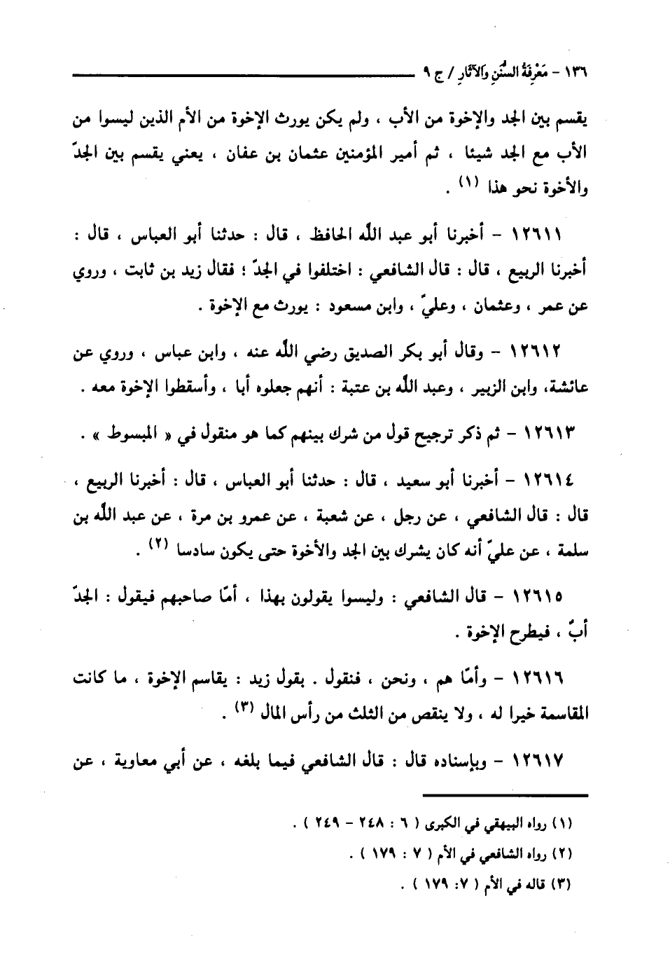 12611 - أَخْبَرَنَا أَبُو عَبْدِ اللَّهِ الْحَافِظُ قَالَ: حَدَّثَنَا أَبُو الْعَبَّاسِ قَالَ: أَخْبَرَنَا الرَّبِيعُ قَالَ: قَالَ الشَّافِعِيُّ: اخْتَلَفُوا فِي الْجَدِّ، فَقَالَ زَيْدُ بْنُ ثَابِتٍ، وَرُوِيَ، عَنْ عُمَرَ، وَعُثْمَانَ، وَعَلِيٍّ، وَابْنِ مَسْعُودٍ: § «يُورَّثُ مَعَ الْإِخْوَةِ»