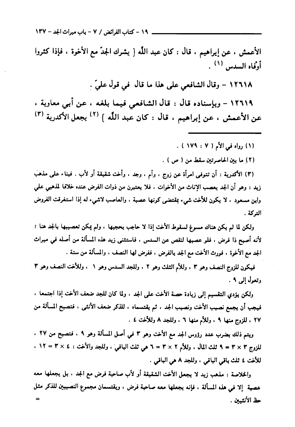 12620 - قَالَ الشَّافِعِيُّ: وَلَيْسُوا يَقُولُونَ بِهَذَا، وَلَكِنَّهُمْ يُرِيدُ بَعْضَ الْعِرَاقِيِّينَ يَقُولُونَ بِمَا رُوِيَ عَنْ زَيْدِ بْنِ ثَابِتٍ: يَجْعَلُهَا مِنْ تِسْعَةِ أَسْهُمٍ، لِلْأُمِّ سَهْمَانِ، وَلِلْجَدِّ سَهْمٌ، وَلِلْأُخْتِ ثَلَاثَةُ أَسْهُمٍ، وَلِلزَّوْجِ ثَلَاثَةُ أَسْهُمٍ، ثُمَّ يُقَاسِمُ الْجَدُّ الْأُخْتَ، فَيُجْعَلُ بَيْنَهُمَا، لِلذَّكَرِ مِثْلُ حَظِّ الْأُنْثَيَيْنِ