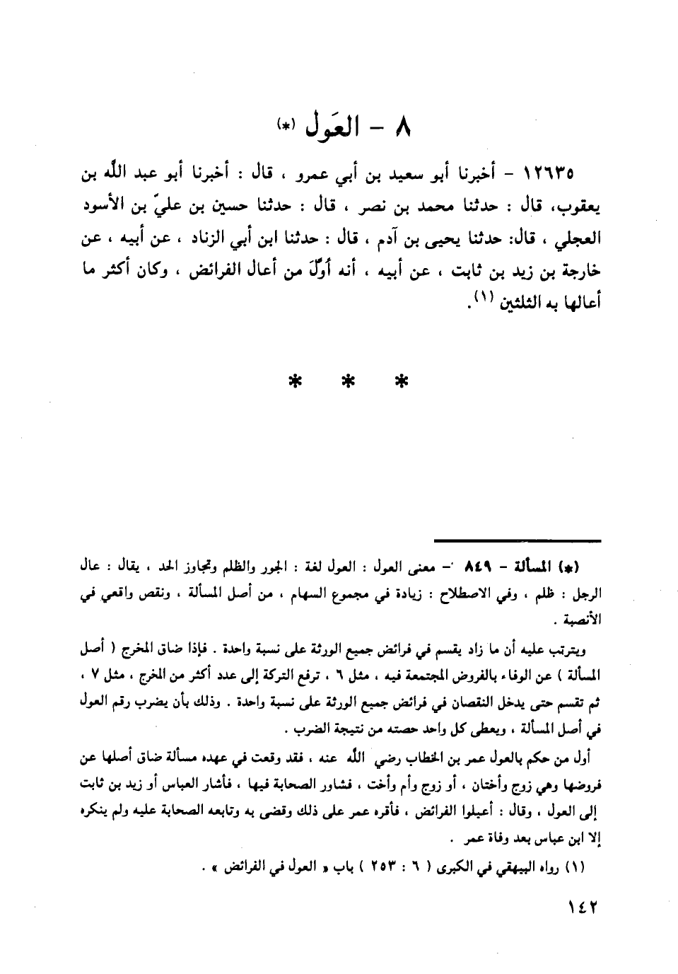 12635 - أَخْبَرَنَا أَبُو سَعِيدِ بْنُ أَبِي عَمْرٍو قَالَ: أَخْبَرَنَا أَبُو عَبْدِ اللَّهِ بْنُ يَعْقُوبَ قَالَ: حَدَّثَنَا مُحَمَّدُ بْنُ نَصْرٍ قَالَ: حَدَّثَنَا حُسَيْنُ بْنُ عَلِيِّ بْنِ الْأَسْوَدِ الْعِجْلِيُّ قَالَ: حَدَّثَنَا يَحْيَى بْنُ آدَمَ قَالَ: حَدَّثَنَا ابْنُ أَبِي الزِّنَادِ، عَنْ أَبِيهِ، عَنْ خَارِجَةَ بْنِ زَيْدِ بْنِ ثَابِتٍ، عَنْ أَبِيهِ: «§أَنَّهُ أَوَّلُ مَنْ أَعَالَ الْفَرَائِضَ، وَكَانَ أَكْثَرُ مَا أَعَالَهَا بِهِ الثُّلُثَيْنِ» ......