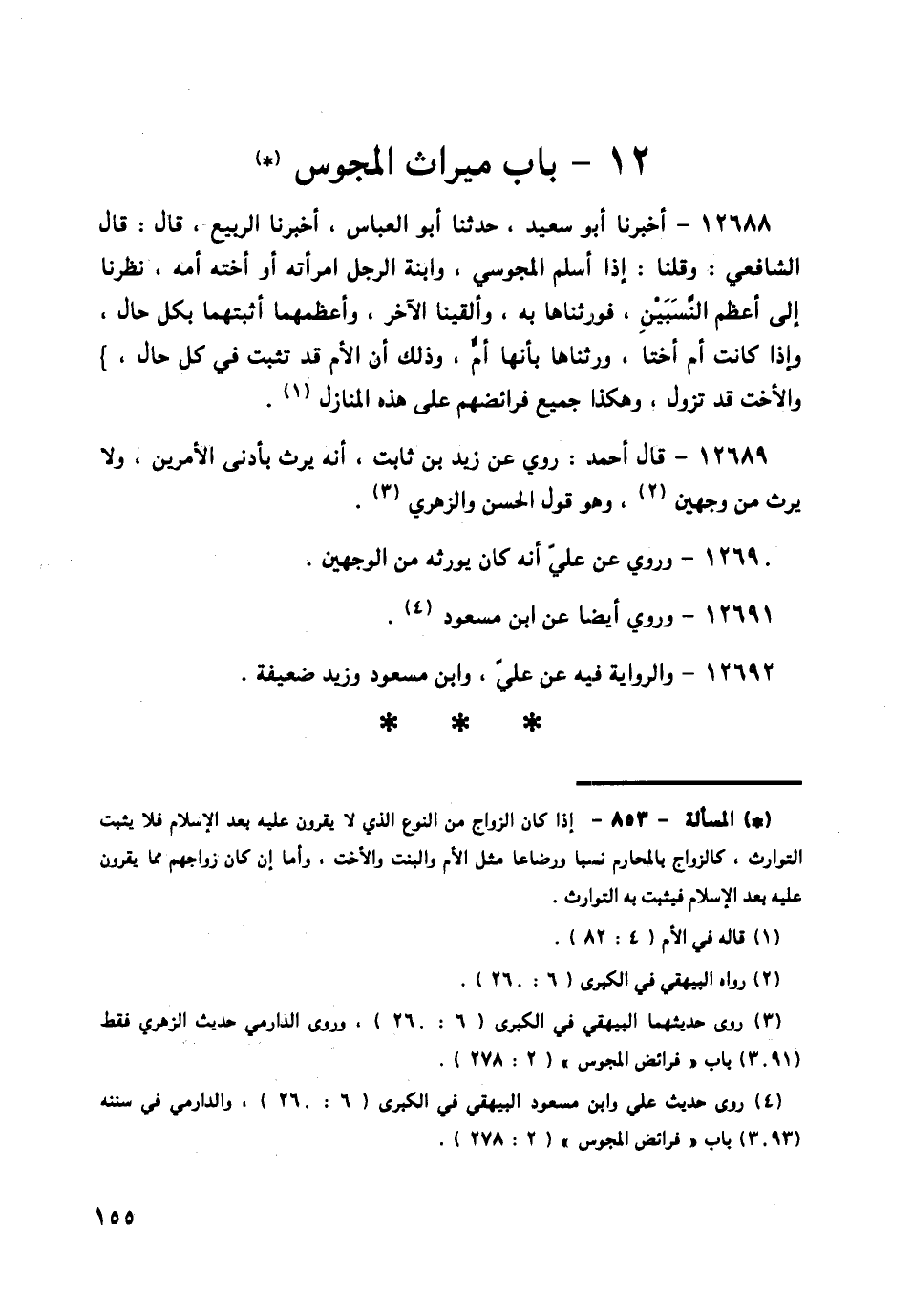 12688 - أَخْبَرَنَا أَبُو سَعِيدٍ، حَدَّثَنَا أَبُو الْعَبَّاسِ، أَخْبَرَنَا الرَّبِيعُ قَالَ: قَالَ الشَّافِعِيُّ، وَقُلْنَا: «§إِذَا أَسْلَمَ الْمَجُوسِيُّ، وَابْنَةُ الرَّجُلِ امْرَأَتَهُ أَوْ أُخْتَهُ أُمِّهِ، نَظَرْنَا إِلَى أَعْظَمِ النَّسَبَيْنِ فَوَرَّثْنَاهَا بِهِ، وَأَلْقَيْنَا الْآخَرَ، وَأَعْظَمُهَا أَثْبَتُهُمَا بِكُلِّ حَالٍ، وَإِذَا كَانَتْ أُمٌّ أُخْتًا وَرَّثْنَاهَا بِأَنَّهَا أُمٌّ، وَذَلِكَ أَنَّ الْأُمَّ قَدْ تَثْبُتُ فِي كُلِّ حَالٍ، وَالْأُخْتُ قَدْ تَزُولُ، وَهَكَذَا جَمِيعُ فَرَائِضِهِمْ عَلَى هَذِهِ الْمَنَازِلِ».