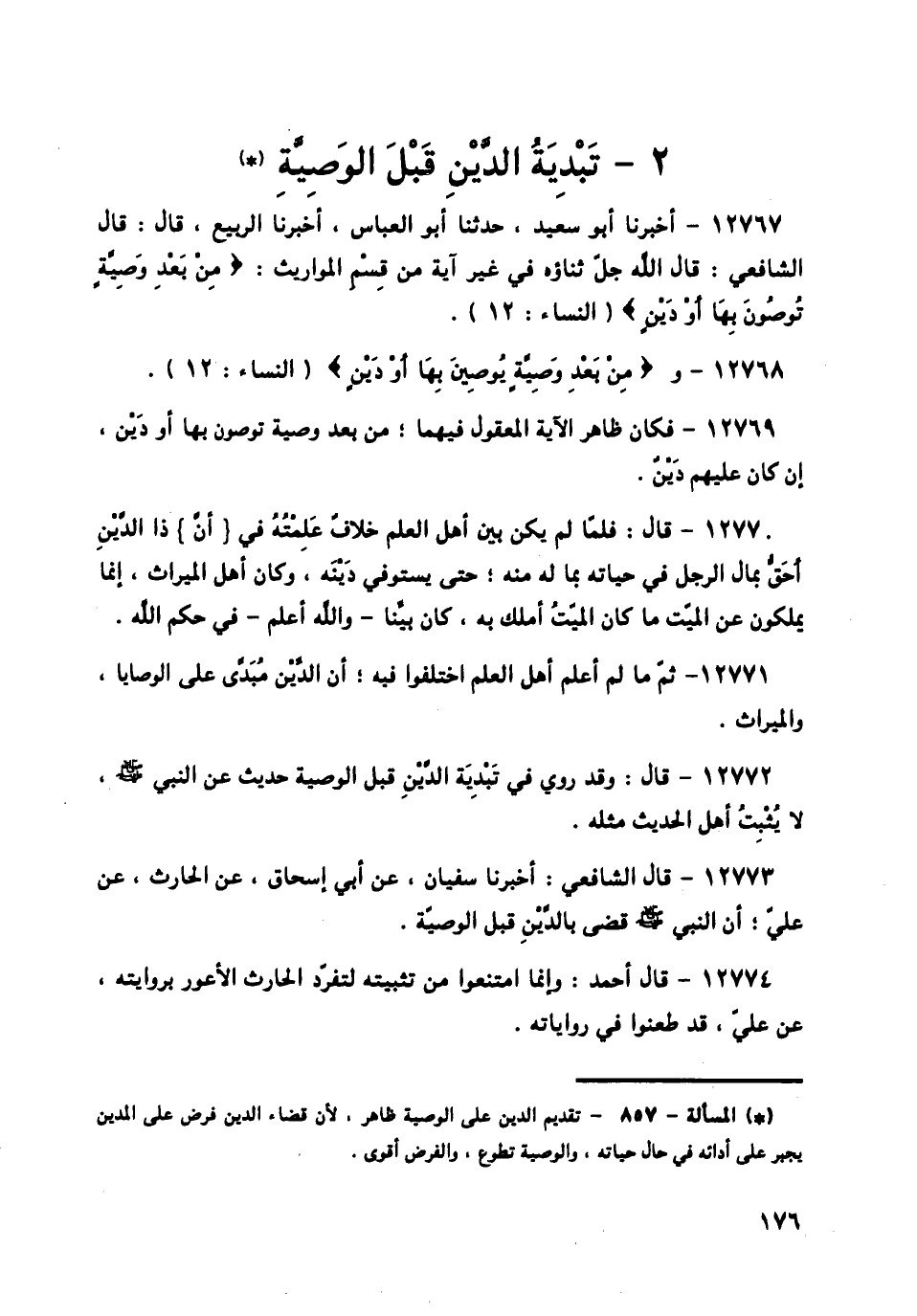 12771 - ثُمَّ مَا لَمْ أَعْلَمْ أَهْلَ الْعِلْمِ اخْتَلَفُوا فِيهِ: أَنَّ الدَّيْنَ مُبَدًّى عَلَى الْوَصَايَا، وَالْمِيرَاثِ.