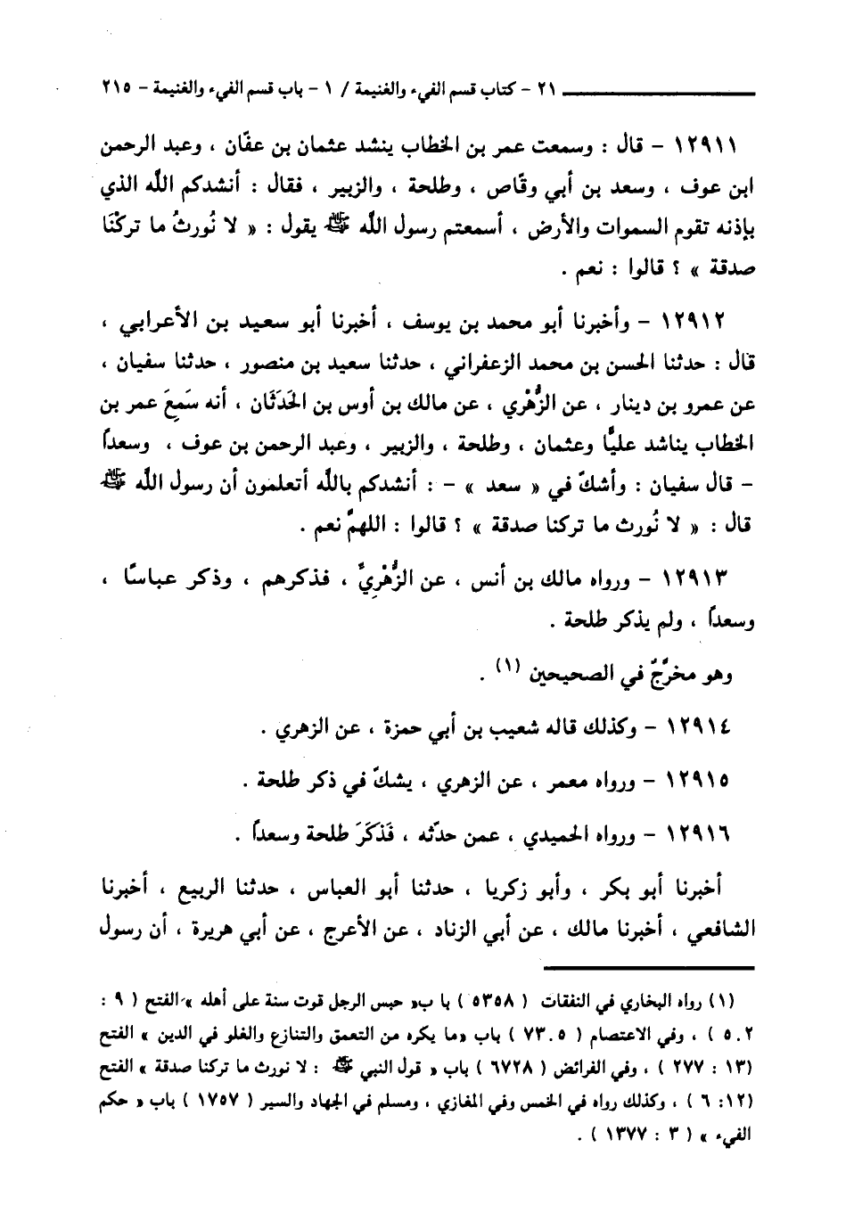 12912 - وَأَخْبَرَنَا أَبُو مُحَمَّدِ بْنُ يُوسُفَ، أَخْبَرَنَا أَبُو سَعِيدِ بْنُ الْأَعْرَابِيِّ قَالَ: حَدَّثَنَا الْحَسَنُ بْنُ مُحَمَّدٍ الزَّعْفَرَانِيُّ، حَدَّثَنَا سَعِيدُ بْنُ مَنْصُورٍ، حَدَّثَنَا سُفْيَانُ، عَنْ عَمْرِو بْنِ دِينَارٍ، عَنِ الزُّهْرِيِّ، عَنْ مَالِكِ بْنِ أَوْسِ بْنِ الْحَدَثَانِ، أَنَّهُ سَمِعَ عُمَرَ بْنَ الْخَطَّابِ، يُنَاشِدُ عَلِيًّا، وَعُثْمَانَ، وَطَلْحَةَ، وَالزُّبَيْرَ، وَعَبْدَ الرَّحْمَنِ بْنَ عَوْفٍ، وَسَعْدًا قَالَ سُفْيَانُ: وَأَشُكُّ فِي سَعْدٍ: أَنْشُدُكُمْ بِاللَّهِ، أَتَعْلَمُونَ أَنَّ رَسُولَ اللَّهِ صَلَّى اللهُ عَلَيْهِ وَسَلَّمَ قَالَ: «§لَا نُورَثُ، مَا تَرَكْنَا صَدَقَةٌ» قَالُوا: اللَّهُمَّ «نَعَمْ».