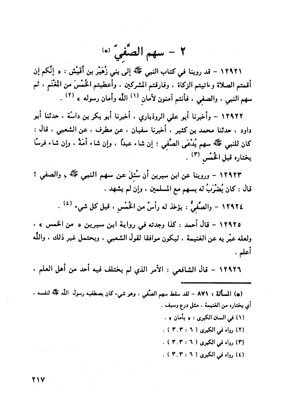 12922 - وَأَخْبَرَنَا أَبُو عَلِيٍّ الرُّوذْبَارِيُّ، أَخْبَرَنَا أَبُو بَكْرِ بْنُ دَاسَةَ، حَدَّثَنَا أَبُو دَاوُدَ، حَدَّثَنَا مُحَمَّدُ بْنُ كَثِيرٍ، أَخْبَرَنَا سُفْيَانُ، عَنْ مُطَرِّفٍ، عَنِ الشَّعْبِيِّ قَالَ: § «كَانَ لِلنَّبِيِّ صَلَّى اللهُ عَلَيْهِ وَسَلَّمَ سَهْمٌ يُدْعَى الصَّفِيَّ، إِنْ شَاءَ عَبْدًا، وَإِنْ شَاءَ أَمَةً، وَإِنْ شَاءَ فَرَسًا يَخْتَارُهُ قَبْلَ الْخُمُسِ»