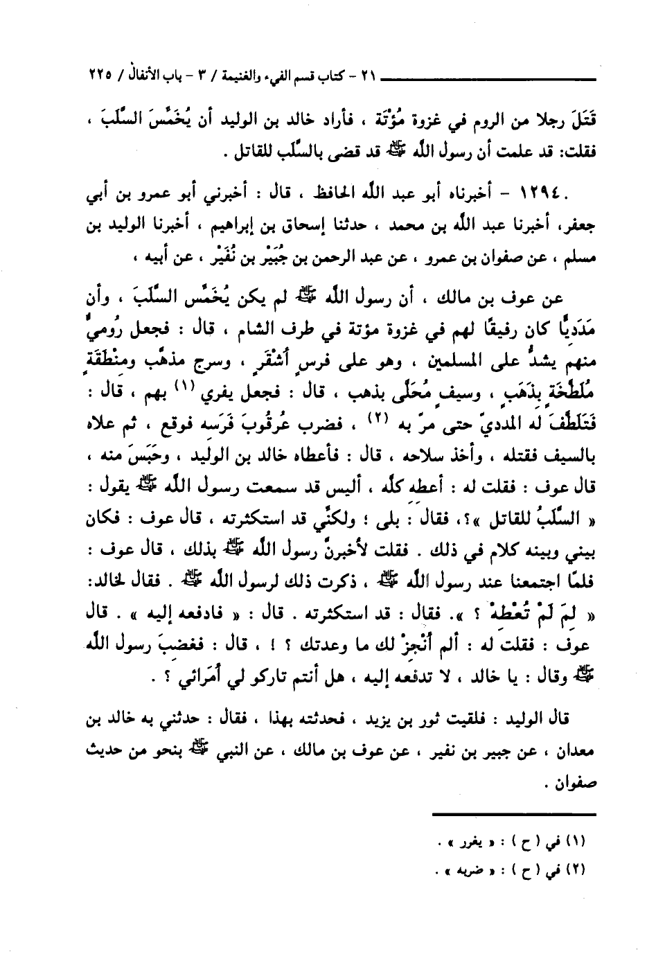 12940 - أَخْبَرَنَاهُ أَبُو عَبْدِ اللَّهِ الْحَافِظُ قَالَ: أَخْبَرَنِي أَبُو عَمْرِو بْنُ أَبِي جَعْفَرٍ، أَخْبَرَنَا عَبْدُ اللَّهِ بْنُ مُحَمَّدٍ، حَدَّثَنَا إِسْحَاقُ بْنُ إِبْرَاهِيمَ، أَخْبَرَنَا الْوَلِيدُ بْنُ مُسْلِمٍ، عَنْ صَفْوَانَ بْنِ عَمْرٍو، عَنْ عَبْدِ الرَّحْمَنِ بْنِ جُبَيْرِ بْنِ نُفَيْرٍ، عَنْ أَبِيهِ، عَنْ عَوْفِ بْنِ مَالِكٍ، أَنَّ رَسُولَ اللَّهِ صَلَّى اللهُ عَلَيْهِ وَسَلَّمَ لَمْ يَكُنْ يُخَمِّسِ السَّلَبَ، وَأَنَّ مَدَدِيًّا كَانَ رَفِيقًا لَهُمْ فِي غَزْوَةِ مُؤْتَةَ فِي طَرَفِ الشَّامِ قَالَ: فَجَعَلَ رُومِيٌّ مِنْهُمْ يَشُدُّ عَلَى الْمُسْلِمِينَ، وَهُوَ عَلَى فَرَسٍ أَشْقَرَ، وَسَرْجٍ مُذَهَّبٍ، وَمِنْطَقَةٍ مُلَطَّخَةٍ بِذَهَبٍ، وَسَيْفٍ مُحَلًّى بِذَهَبٍ قَالَ: فَجَعَلَ يَفْرِي بِهِمْ قَالَ: فَتَلَطَّفَ لَهُ الْمَدَدِيُّ حَتَّى مَرَّ بِهِ، فَضَرَبَ عُرْقُوبَ فَرَسِهِ فَوَقَعَ، ثُمَّ عَلَاهُ بِالسَّيْفِ فَقَتَلَهُ، وَأَخَذَ سِلَاحَهُ قَالَ: فَأَعْطَاهُ خَالِدَ بْنَ الْوَلِيدِ، وَحَبَسَ مِنْهُ قَالَ عَوْفٌ: فَقُلْتُ لَهُ: أَعْطِهِ كُلَّهُ، أَلَيْسَ قَدْ سَمِعْتَ رَسُولَ اللَّهِ صَلَّى اللهُ عَلَيْهِ وَسَلَّمَ يَقُولُ: «§السَّلَبُ لِلْقَاتِلِ» فَقَالَ: بَلَى، وَلَكِنِّي قَدِ اسْتَكْثَرْتُهُ قَالَ عَوْفٌ: فَكَانَ بَيْنِي وَبَيْنَهُ كَلَامٌ فِي ذَلِكَ. فَقُلْتُ لَأُخْبِرَنَّ رَسُولَ اللَّهِ صَلَّى اللهُ عَلَيْهِ وَسَلَّمَ بِذَلِكَ قَالَ عَوْفٌ: فَلَمَّا اجْتَمَعْنَا عِنْدَ رَسُولِ اللَّهِ صَلَّى اللهُ عَلَيْهِ وَسَلَّمَ، ذَكَرْتُ ذَلِكَ لِرَسُولِ اللَّهِ صَلَّى اللهُ عَلَيْهِ وَسَلَّمَ، فَقَالَ لِخَالِدٍ: «لِمَ لَمْ تُعْطِهِ؟» فَقَالَ: قَدِ اسْتَكْثَرْتُهُ. قَالَ: «فَادْفَعْهُ إِلَيْهِ». قَالَ عَوْفٌ: فَقُلْتُ لَهُ: أَلَمْ أُنْجِزْ لَكَ مَا وَعَدْتُكَ؟ قَالَ: فَغَضِبَ رَسُولُ اللَّهِ صَلَّى اللهُ عَلَيْهِ وَسَلَّمَ، وَقَالَ: «يَا خَالِدُ، لَا تَدْفَعْهُ إِلَيْهِ، هَلْ أَنْتُمْ تَارِكُو لِي أُمَرَائِي؟». قَالَ الْوَلِيدُ: فَلَقِيتُ ثَوْرَ بْنَ يَزِيدَ، فَحَدَّثْتُهُ بِهَذَا، فَقَالَ: حَدَّثَنِي بِهِ خَالِدُ بْنُ مَعْدَانَ، عَنْ جُبَيْرِ بْنِ نُفَيْرٍ، عَنْ عَوْفِ بْنِ مَالِكٍ، عَنِ النَّبِيِّ صَلَّى اللهُ عَلَيْهِ وَسَلَّمَ بِنَحْوٍ مِنْ حَدِيثِ صَفْوَانَ -[226]-. رَوَاهُ مُسْلِمٌ فِي الصَّحِيحِ عَنْ زُهَيْرِ بْنِ حَرْبٍ، عَنِ الْوَلِيدِ بْنِ مُسْلِمٍ