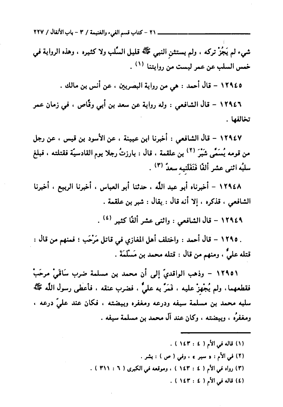 12947 - قَالَ الشَّافِعِيُّ: أَخْبَرَنَا ابْنُ عُيَيْنَةَ، عَنِ الْأَسْوَدِ بْنِ قَيْسٍ، عَنْ رَجُلٍ مِنْ قَوْمِهِ يُسَمَّى شِبْرَ بْنَ عَلْقَمَةَ قَالَ: «§بَارَزْتُ رَجُلًا يَوْمَ الْقَادِسِيَّةِ فَقَتَلْتُهُ، فَبَلَغَ سَلَبُهُ اثْنَيْ عَشَرَ أَلْفًا فَنَفَّلَنِيهِ سَعْدٌ».