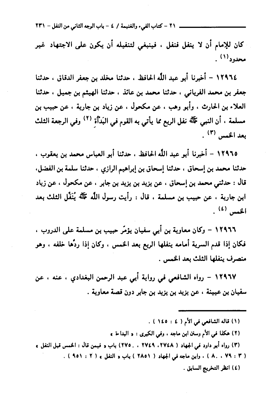 12966 - وَكَانَ مُعَاوِيَةُ بْنُ أَبِي سُفْيَانَ يُؤَمِّرُ حَبِيبَ بْنَ مَسْلَمَةَ عَلَى الدُّرُوبِ، فَكَانَ إِذَا قَدَّمَ السَّرِيَّةَ أَمَامَهُ يُنَفِّلُهَا الرُّبُعَ بَعْدَ الْخُمُسِ، وَكَانَ إِذَا رَدَّهَا خَلْفَهُ، وَهُوَ مُنْصَرِفٌ يُنَفِّلُهَا الثُّلُثَ بَعْدَ الْخُمُسِ.