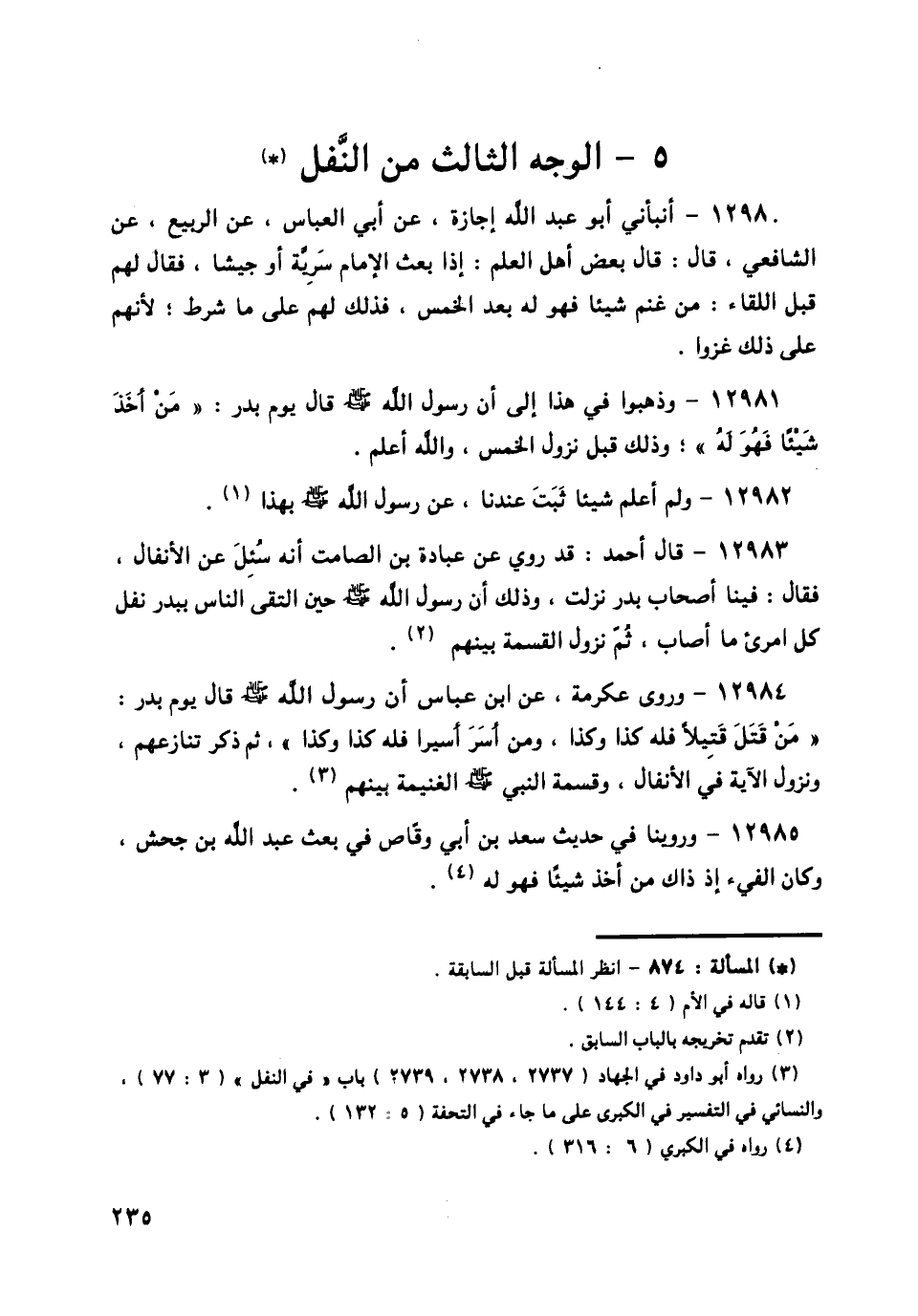 12986 - قَالَ أَحْمَدُ: وَقَدْ كَانَ ذَلِكَ قَبْلَ وَقْعَةِ بَدْرٍ، وَقَدْ صَارَ الْأَمْرُ بَعْدَ نُزُولِ الْآيَةِ إِلَى مَا اخْتَارَهُ الشَّافِعِيُّ مِنْ قِسْمَةِ أَرْبَعَةِ أَخْمَاسِ الْغَنِيمَةِ بَيْنَ مَنْ حَضَرَ الْقِتَالَ، وَأَرْبَعَةَ أَخْمَاسِ الْخُمُسِ عَلَى أَهْلِهِ، وَأَنَّ النَّبِيَّ صَلَّى اللهُ عَلَيْهِ وَسَلَّمَ كَانَ يَضَعُ سَهْمَهُ حَيْثُ أَرَاهُ اللَّهُ وَهُوَ خُمُسُ الْخُمُسِ، وَاللَّهُ أَعْلَمُ