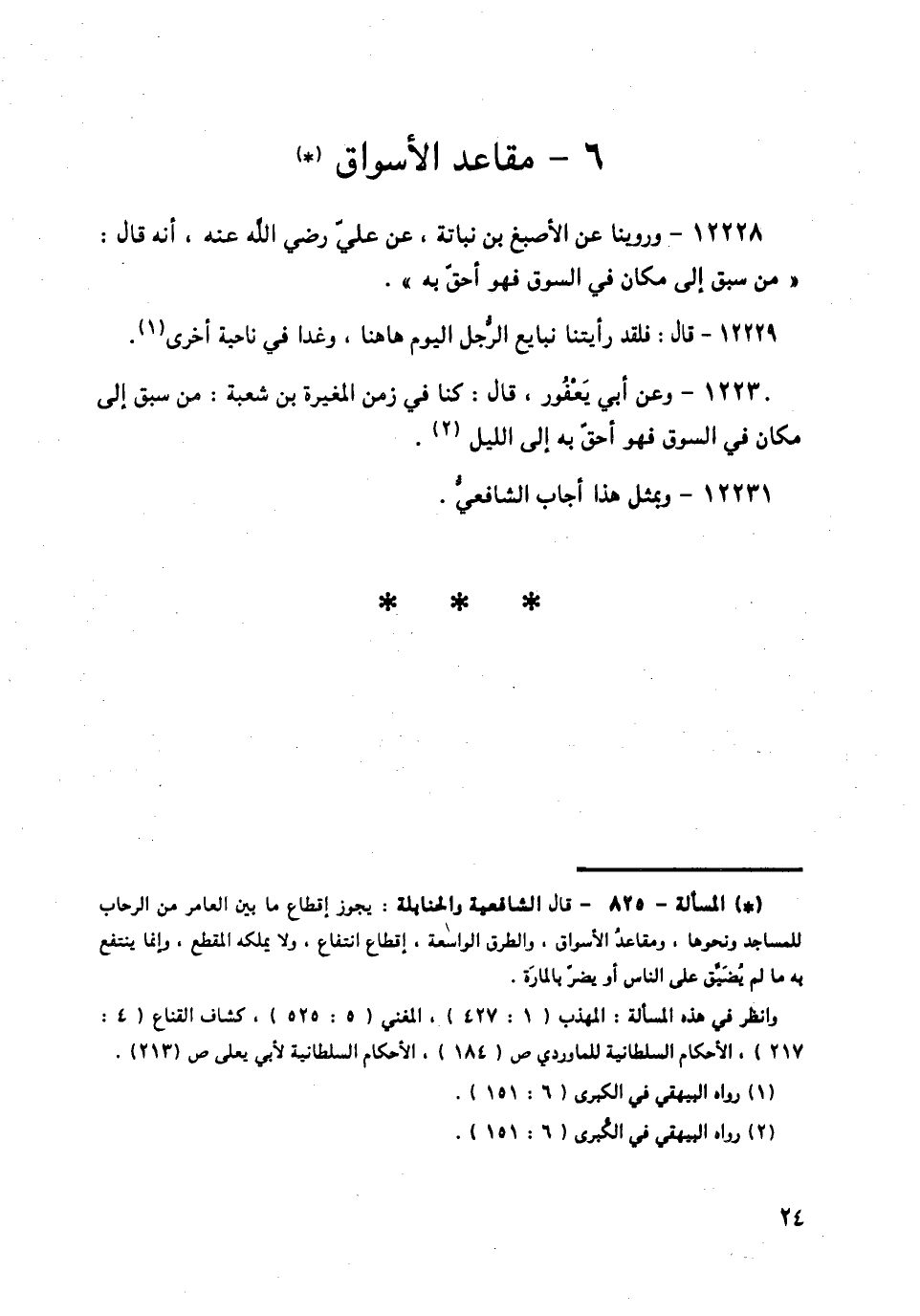 12228 - وَرُوِّينَا، عَنِ الْأَصْبَغِ بْنِ نُبَاتَةَ، عَنْ عَلِيٍّ، رَضِيَ اللَّهُ عَنْهُ أَنَّهُ قَالَ: § «مَنْ سَبَقَ إِلَى مَكَانٍ فِي السُّوقِ فَهُوَ أَحَقُّ بِهِ».