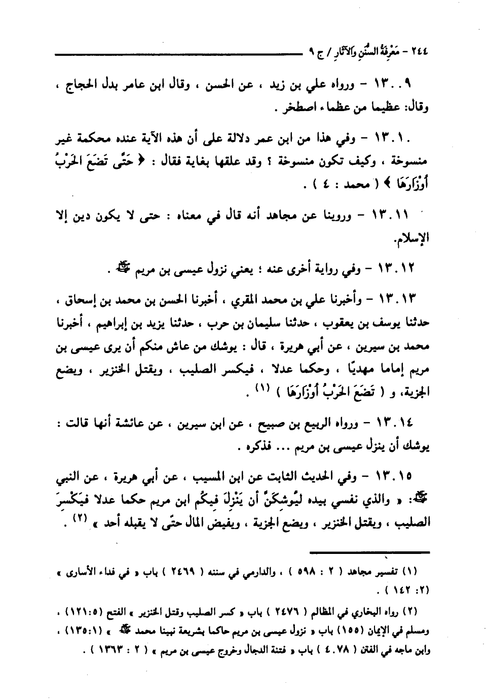 13015 - وَفِي الْحَدِيثِ الثَّابِتِ عَنِ ابْنِ الْمُسَيِّبِ، عَنْ أَبِي هُرَيْرَةَ، عَنِ النَّبِيِّ صَلَّى اللهُ عَلَيْهِ وَسَلَّمَ: «وَالَّذِي نَفْسِي بِيَدِهِ، §لَيُوشِكَنَّ أَنْ يَنْزِلَ فِيكُمُ ابْنُ مَرْيَمَ حَكَمًا عَدْلًا فَيَكْسِرَ الصَّلِيبَ، وَيَقْتُلَ الْخِنْزِيرَ، وَيَضَعَ الْجِزْيَةَ، وَيَفِيضَ الْمَالُ حَتَّى لَا يَقْبَلَهُ أَحَدٌ» -[245]-.