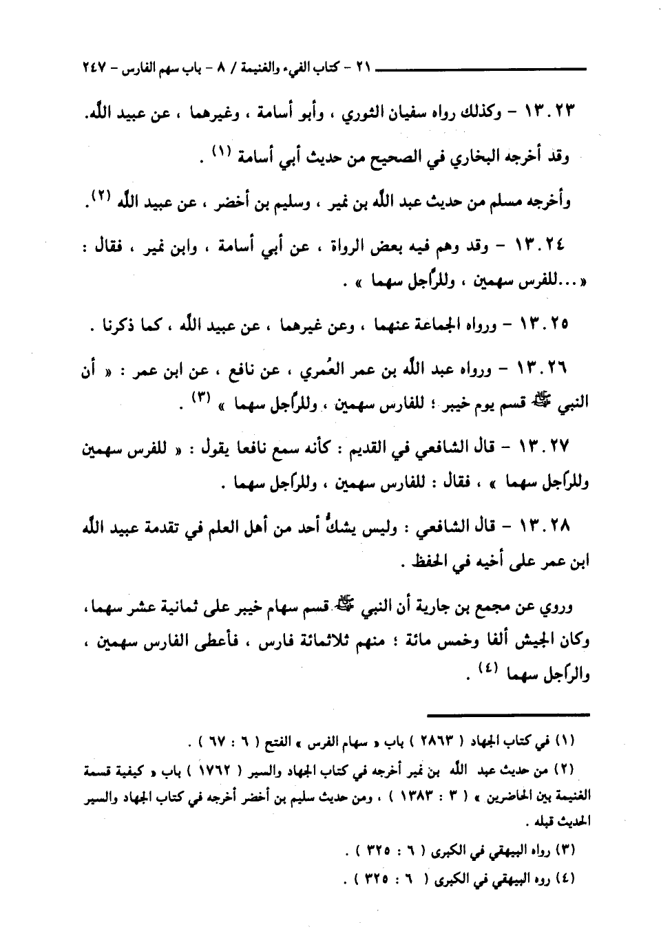 13027 - قَالَ الشَّافِعِيُّ فِي الْقَدِيمِ: كَأَنَّهُ سَمِعَ نَافِعًا، يَقُولُ: لِلْفَرَسِ سَهْمَيْنِ، وَلِلرَّاجِلِ سَهْمًا، فَقَالَ: لِلْفَارِسِ سَهْمَيْنِ، وَلِلرَّاجِلِ سَهْمًا -[248]-