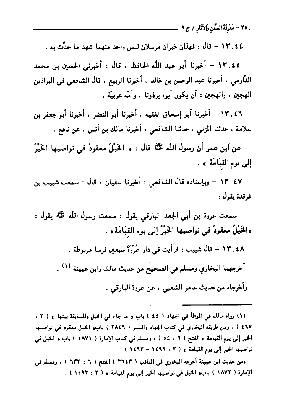 13046 - أَخْبَرَنَا أَبُو إِسْحَاقَ الْفَقِيهُ، أَخْبَرَنَا أَبُو النَّضْرِ، أَخْبَرَنَا أَبُو جَعْفَرِ بْنُ سَلَامَةَ، حَدَّثَنَا الْمُزَنِيُّ، حَدَّثَنَا الشَّافِعِيُّ، أَخْبَرَنَا مَالِكُ بْنُ أَنَسٍ، عَنْ نَافِعٍ، عَنِ ابْنِ عُمَرَ، أَنَّ رَسُولَ اللَّهِ صَلَّى اللهُ عَلَيْهِ وَسَلَّمَ قَالَ: § «الْخَيْلُ مَعْقُودٌ فِي نَوَاصِيهَا الْخَيْرُ إِلَى يَوْمِ الْقِيَامَةِ»