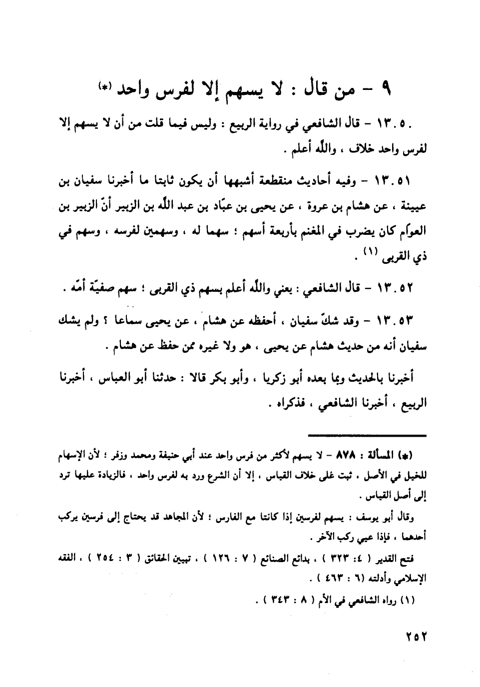 13051 - وَفِيهِ أَحَادِيثُ مُنْقَطِعَةٌ أَشْبَهُهَا أَنْ يَكُونَ ثَابِتًا مَا أَخْبَرَنَا سُفْيَانُ بْنُ عُيَيْنَةَ، عَنْ هِشَامِ بْنِ عُرْوَةَ، عَنْ يَحْيَى بْنِ عَبَّادِ بْنِ عَبْدِ اللَّهِ بْنِ الزُّبَيْرِ، §" أَنَّ الزُّبَيْرَ بْنَ الْعَوَّامِ كَانَ يَضْرِبُ فِي الْمَغْنَمِ بِأَرْبَعَةِ أَسْهُمٍ: سَهْمٍ لَهُ، وَسَهْمَيْنِ لِفَرَسِهِ، وَسَهْمٍ فِي ذِي الْقُرْبَى ".