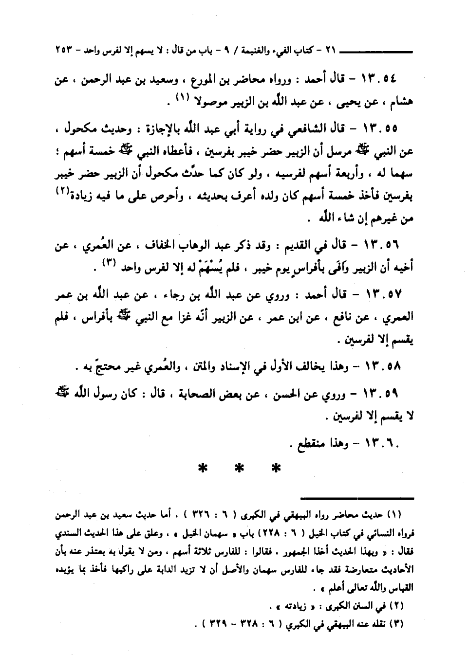 13059 - وَرُوِيَ عَنِ الْحَسَنِ، عَنْ بَعْضِ الصَّحَابَةِ قَالَ: «كَانَ رَسُولُ اللَّهِ صَلَّى اللهُ عَلَيْهِ وَسَلَّمَ §لَا يَقْسِمُ إِلَّا لِفَرَسَيْنِ».