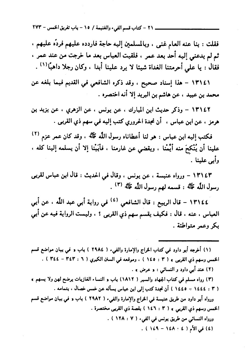 13148 - قُلْتُ: أَفَتَجِدُ سَهْمَ ذِي الْقُرْبَى مَفْرُوضًا فِي آيَتَيْنِ مِنْ كِتَابِ اللَّهِ مُبَيَّنًا عَلَى لِسَانِ رَسُولِ اللَّهِ صَلَّى اللهُ عَلَيْهِ وَسَلَّمَ، وَيَفْعَلُهُ بِأَثْبَتِ مَا يَكُونُ مِنْ أَخْبَارِ النَّاسِ مِنْ وَجْهَيْنِ، أَحَدُهُمَا ثِقَةُ الْمُخْبِرِينَ بِهِ، وَاتِّصَالُهُ، وَأَنَّهُمْ كُلَّهُمْ أَهْلُ قَرَابَةٍ لِرَسُولِ اللَّهِ صَلَّى اللهُ عَلَيْهِ وَسَلَّمَ، الزُّهْرِيُّ مِنْ أَخْوَالِهِ، وَابْنُ الْمُسَيِّبِ مِنْ أَخْوَالِ أَبِيهِ، وَجُبَيْرُ بْنُ مُطْعِمٍ ابْنُ عَمِّهِ، وَكُلُّهُمْ قَرِيبٌ مِنْهُ فِي جَذْمِ النَّسَبِ، وَهُمْ يُخْبِرُونَكَ مَعَ قَرَابَتِهِمْ، وَشَرَفِهِمْ أَنَّهُمْ مُخْرَجُونَ مِنْهُ، وَأَنَّ غَيْرَهُمْ مَخْصُوصٌ بِهِ دُونَهُمْ، وَيُخْبِرُكَ جُبَيْرٌ أَنَّهُ طَلَبَهُ هُوَ وَعُثْمَانُ، فَمَنَعَاهُ، فَمَتَى تَجِدُ سُنَّةً أَثْبَتَ بِفَرْضِ الْكِتَابِ، وَصِحَّةِ الْمُخْبِرِ، وَهَذِهِ الدَّلَالَاتُ مِنْ هَذِهِ السُّنَّةِ الَّتِي لَمْ يُعَارِضْهَا عَنْ رَسُولِ اللَّهِ صَلَّى اللهُ عَلَيْهِ وَسَلَّمَ مُعَارِضٌ بِخِلَافِهَا. ثُمَّ بَسَطَ الْكَلَامَ فِي هَذَا.