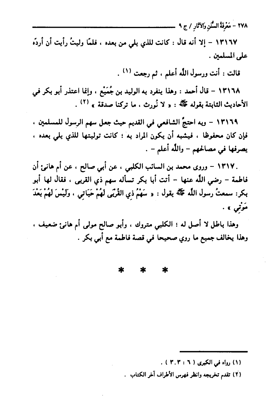 13170 - وَرَوَى مُحَمَّدُ بْنُ السَّائِبِ الْكَلْبِيُّ، عَنْ أَبِي صَالِحٍ، عَنْ أُمِّ هَانِئٍ، " أَنَّ فَاطِمَةَ رَضِيَ اللَّهُ عَنْهَا أَتَتْ أَبَا بَكْرٍ تَسْأَلُهُ سَهْمَ ذِي الْقُرْبَى، فَقَالَ لَهَا أَبُو بَكْرٍ: سَمِعْتُ رَسُولَ اللَّهِ صَلَّى اللهُ عَلَيْهِ وَسَلَّمَ يَقُولُ: «§سَهْمُ ذِي الْقُرْبَى لَهُمْ حَيَاتِي، وَلَيْسَ لَهُمْ بَعْدَ مَوْتِي». وَهَذَا بَاطِلٌ لَا أَصْلَ لَهُ، الْكَلْبِيُّ مَتْرُوكٌ، وَأَبُو صَالِحٍ مَوْلَى أُمِّ هَانِئٍ ضَعِيفٌ، وَهَذَا يُخَالِفُ جَمِيعَ مَا رُوِيَ صَحِيحًا فِي قِصَّةِ فَاطِمَةَ مَعَ أَبِي بَكْرٍ