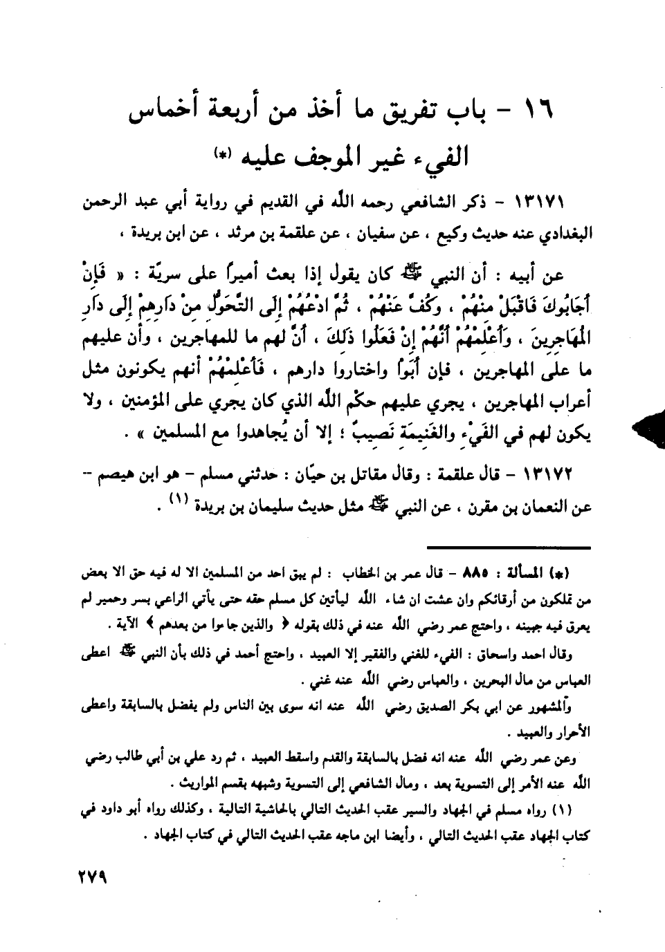 13171 - ذَكَرَ الشَّافِعِيُّ رَحِمَهُ اللَّهُ فِي الْقَدِيمِ فِي رِوَايَةِ أَبِي عَبْدِ الرَّحْمَنِ الْبَغْدَادِيِّ عَنْهُ حَدِيثَ وَكِيعٍ، عَنْ سُفْيَانَ، عَنْ عَلْقَمَةَ بْنِ مَرْثَدٍ، عَنِ ابْنِ بُرَيْدَةَ، عَنْ أَبِيهِ، أَنَّ النَّبِيَّ صَلَّى اللهُ عَلَيْهِ وَسَلَّمَ كَانَ يَقُولُ إِذَا بَعَثَ أَمِيرًا عَلَى سَرِيَّةٍ: «§فَإِنْ أَجَابُوكَ فَاقْبَلْ مِنْهُمْ، وَكُفَّ عَنْهُمْ، ثُمَّ ادْعُهُمْ إِلَى التَّحَوُّلِ مِنْ دَارِهِمْ إِلَى دَارِ الْمُهَاجِرِينَ، وَأَعْلِمْهُمْ أَنَّهُمْ إِنْ فَعَلُوا ذَلِكَ، أَنَّ لَهُمُ مَا لِلْمُهَاجِرِينَ، وَأَنَّ عَلَيْهِمْ مَا عَلَى الْمُهَاجِرِينَ، فَإِنْ أَبَوْا وَاخْتَارُوا دَارَهُمْ، فَأَعْلِمْهُمْ أَنَّهُمْ يَكُونُونَ مِثْلَ أَعْرَابِ الْمُهَاجِرِينَ، يَجْرِي عَلَيْهِمْ حُكْمُ اللَّهِ الَّذِي كَانَ يَجْرِي عَلَى الْمُؤْمِنِينَ، وَلَا يَكُونُ لَهُمْ فِي الْفَيْءِ، وَالْغَنِيمَةِ نَصِيبٌ، إِلَّا أَنْ يُجَاهِدُوا مَعَ الْمُسْلِمِينَ».