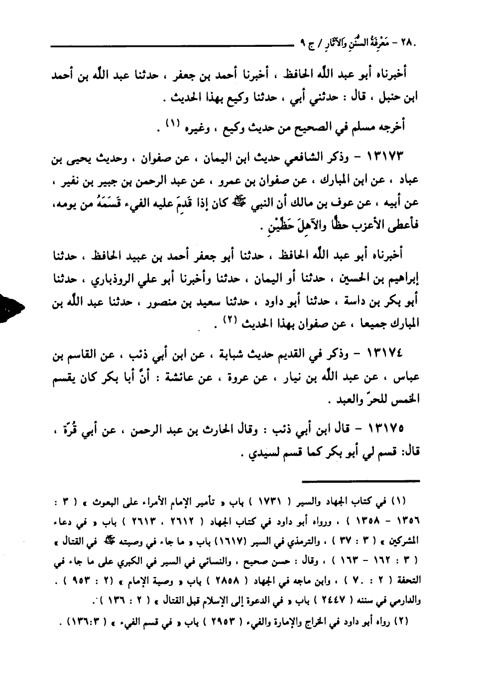 13173 - وَذَكَرَ الشَّافِعِيُّ حَدِيثَ ابْنِ الْيَمَانِ، عَنْ صَفْوَانَ، وَحَدِيثَ يَحْيَى بْنِ عَبَّادٍ، عَنِ ابْنِ الْمُبَارَكِ، عَنْ صَفْوَانَ بْنِ عَمْرٍو، عَنْ عَبْدِ الرَّحْمَنِ بْنِ جُبَيْرِ بْنِ نُفَيْرٍ، عَنْ أَبِيهِ، عَنْ عَوْفِ بْنِ مَالِكٍ «أَنَّ النَّبِيَّ صَلَّى اللهُ عَلَيْهِ وَسَلَّمَ كَانَ §إِذَا قَدِمَ عَلَيْهِ الْفَيْءُ قَسَمَهُ مِنْ يَوْمِهِ، فَأَعْطَى الْأَعْزَبَ حَظًّا وَالْآهِلَ حَظَّيْنِ». أَخْبَرَنَاهُ أَبُو عَبْدِ اللَّهِ الْحَافِظُ، حَدَّثَنَا أَبُو جَعْفَرٍ أَحْمَدُ بْنُ عُبَيْدٍ الْحَافِظُ، حَدَّثَنَا إِبْرَاهِيمُ بْنُ الْحُسَيْنِ، حَدَّثَنَا أَبُو الْيَمَانِ، حَدَّثَنَا وَأَخْبَرَنَا أَبُو عَلِيِّ الرُّوذْبَارِيُّ، حَدَّثَنَا أَبُو بَكْرِ بْنُ دَاسَةَ، حَدَّثَنَا أَبُو دَاوُدَ، حَدَّثَنَا سَعِيدُ بْنُ مَنْصُورٍ، حَدَّثَنَا عَبْدُ اللَّهِ بْنُ الْمُبَارَكِ جَمِيعًا، عَنْ صَفْوَانَ بِهَذَا الْحَدِيثِ